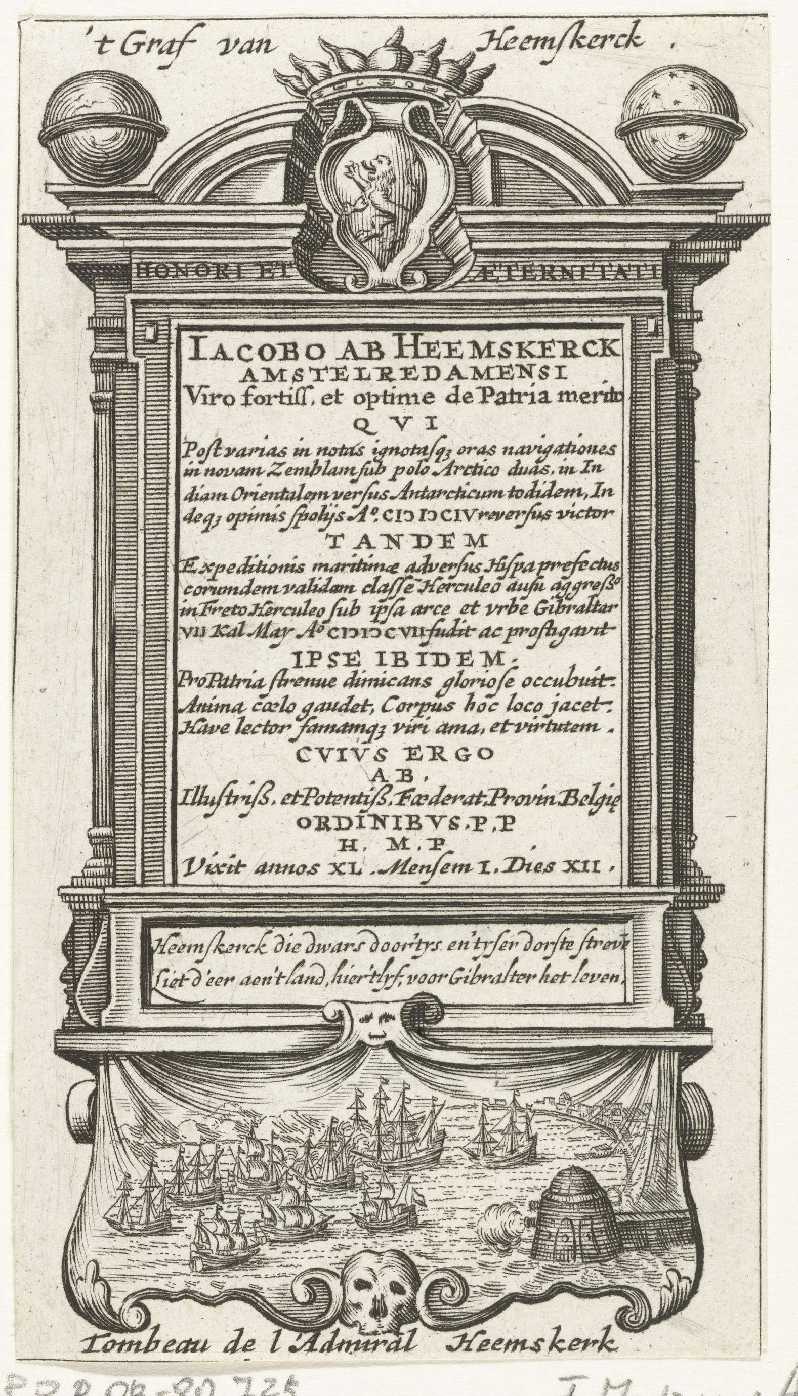 Grafmonument of memorietafel voor admiraal Jacob van Heemskerck in de Oude Kerk te Amsterdam. Gesneuveld tijdens de zeeslag tussen de Staatse en Spaanse vloten in de baai van Gibraltar op 25 april 1607 en begraven op 8 juni 1607. Memorietafel met tekst in het Latijn en tweeregelig vers in het Nederlands. Onderaan een voorstelling van ...