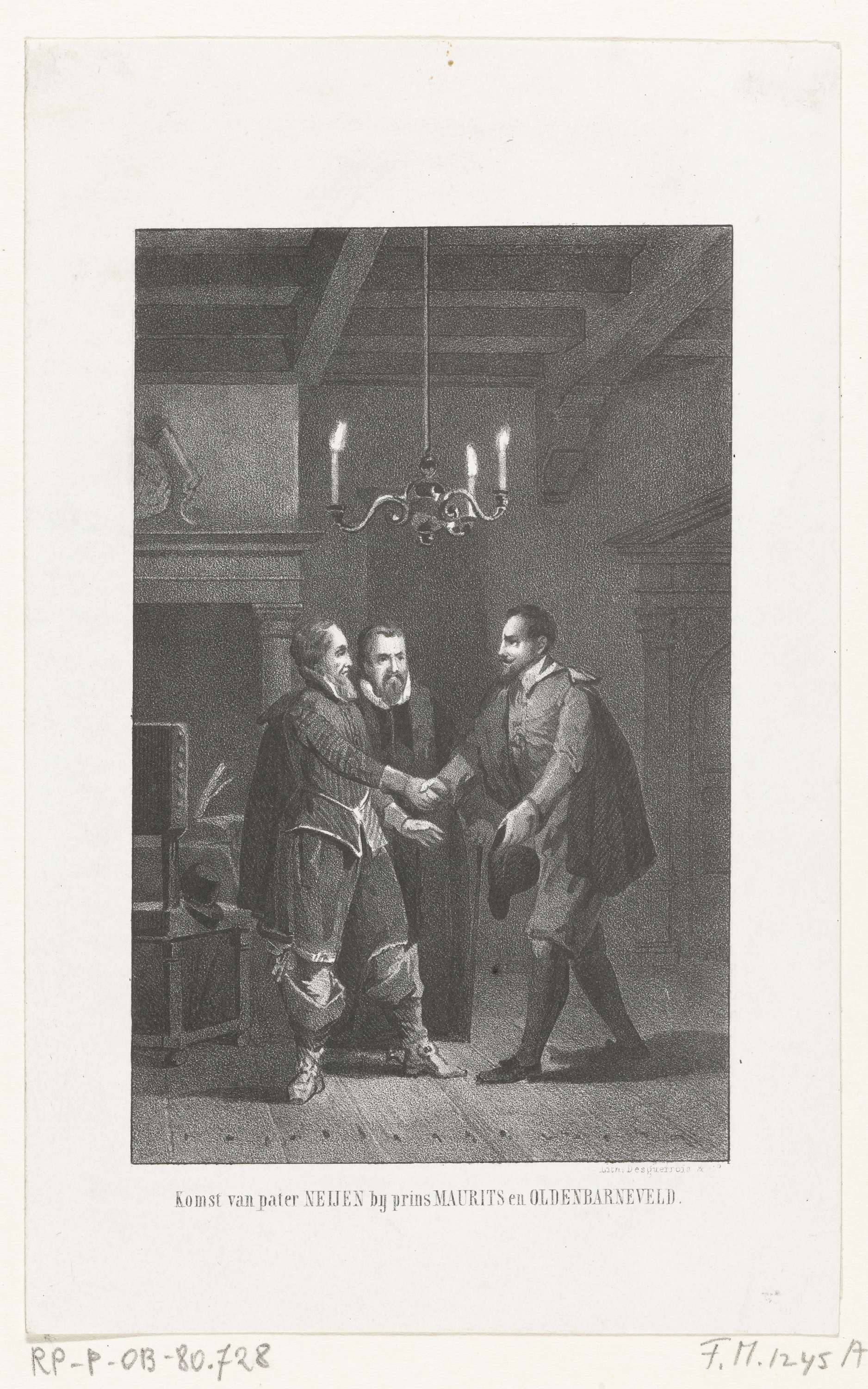 De ontmoeting tussen pater Jan Neyen, prins Maurits en Johan van Oldenbarnevelt te Den Haag om te onderhandelen over een bestand, mei 1607. De pater en de prins schudden elkaar de hand in een interieur bij kaarslicht.