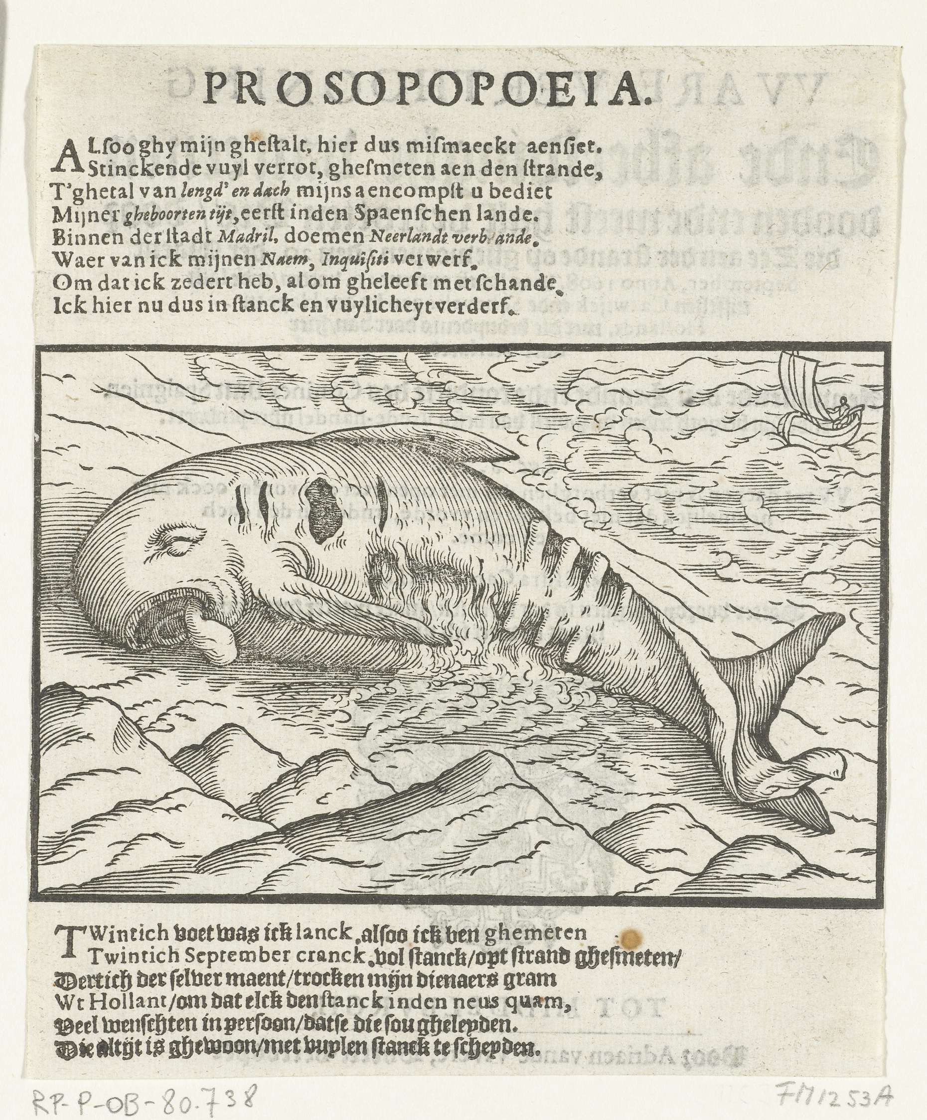 Het halfverotte kadaver van een griend aangespoeld op het strand tussen Scheveningen en Katwijk, 20 september 1608. Gebruikt als illustratie op de keerzijde van de titel in een pamflet tegen de vredesonderhandelingen met Spanje. Het kadaver wordt geïnterpreteerd als symbool voor de huidige staat van de koning van Spanje.