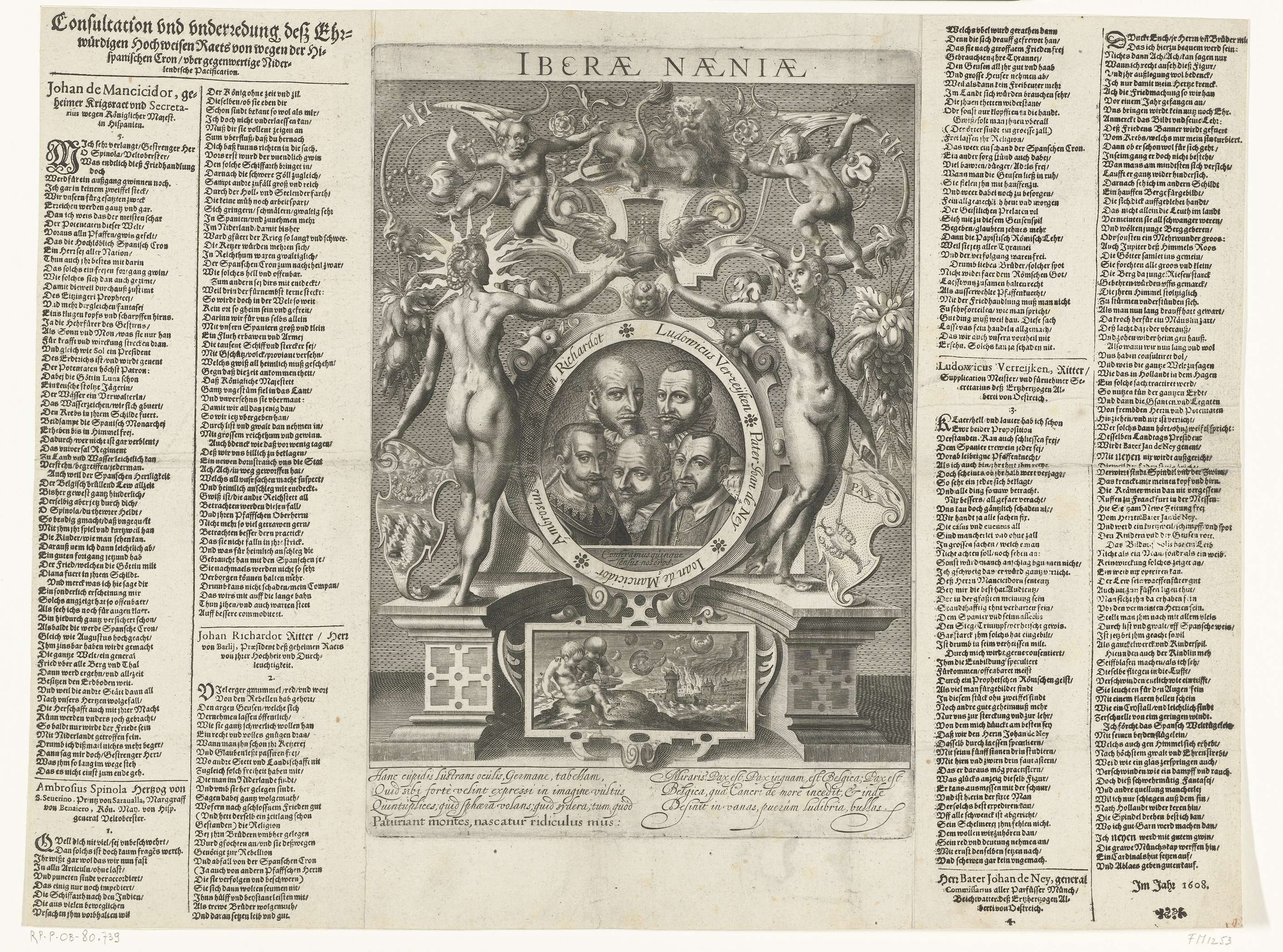 Allegorie op de zinloosheid van de vredesonderhandelingen met Spanje, 1608. Ovaal portret van de vijf Spaanse gezanten: Juan de Mancicidor, Ambrogio Spinola, Jean Richardot, Lodewijk Verreyken en Jan Neyen. In een allegorische omlijsting met naakte vrouwelijk personificaties van de zon en de maan, een leeuw, emblematische schilden, putti en festoenen. Onderaan een cartouche met bellenblazende ...