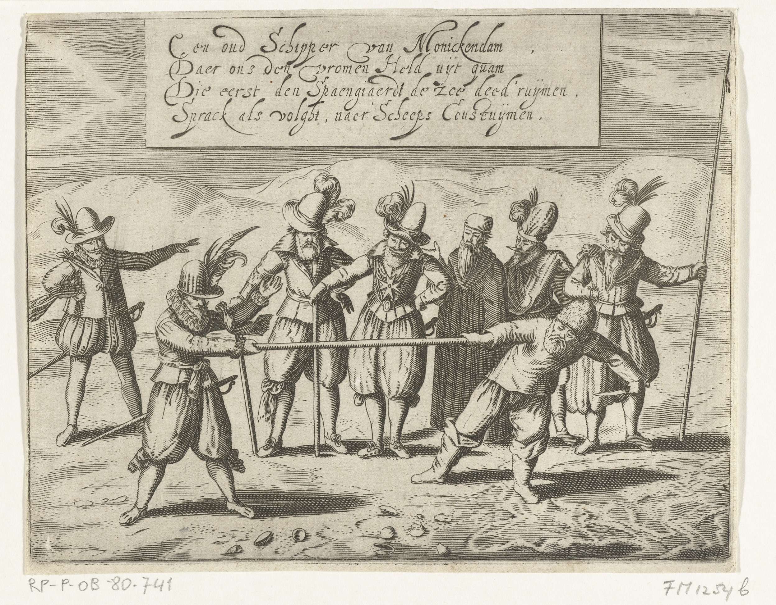 De strijd om de Gouden Stok, 1608. Op het strand strijden een Hollandse schipper en een Spanjaard om een stok die zij beiden met een hand vasthouden. Op de achtergrond zes toeschouwers, waaronder prins Maurits (links) en koning Hendrik IV van Frankrijk (midden). De trekwedstrijd verbeeldt de strijd tussen de Republiek en Spanje om de ...