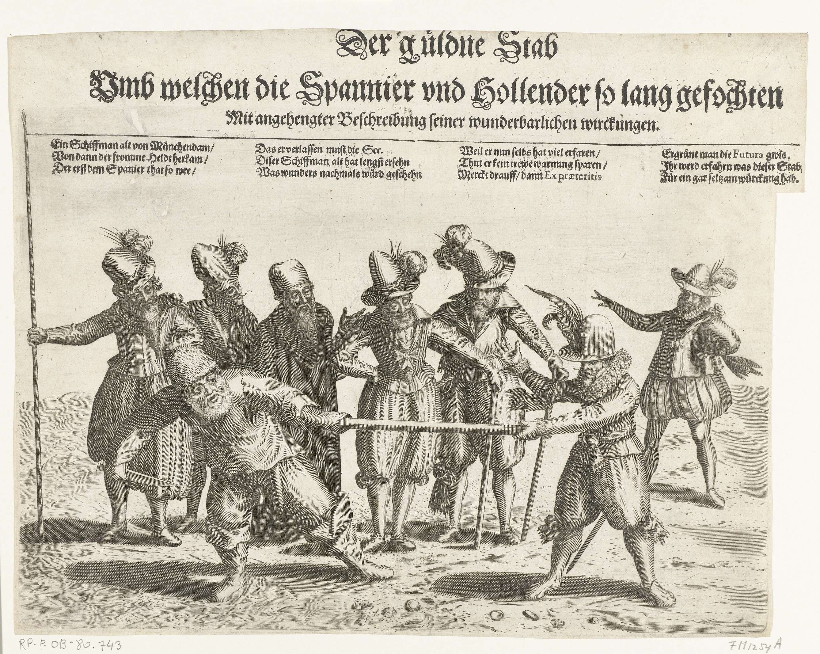 Grote versie van de strijd om de Gouden Stok, 1608. Op het strand strijden een Hollandse schipper en een Spanjaard om een stok die zij beiden met een hand vasthouden. Op de achtergrond zes toeschouwers, waaronder prins Maurits (rechts) en koning Hendrik IV van Frankrijk (midden). De trekwedstrijd verbeeldt de strijd tussen de Republiek en ...