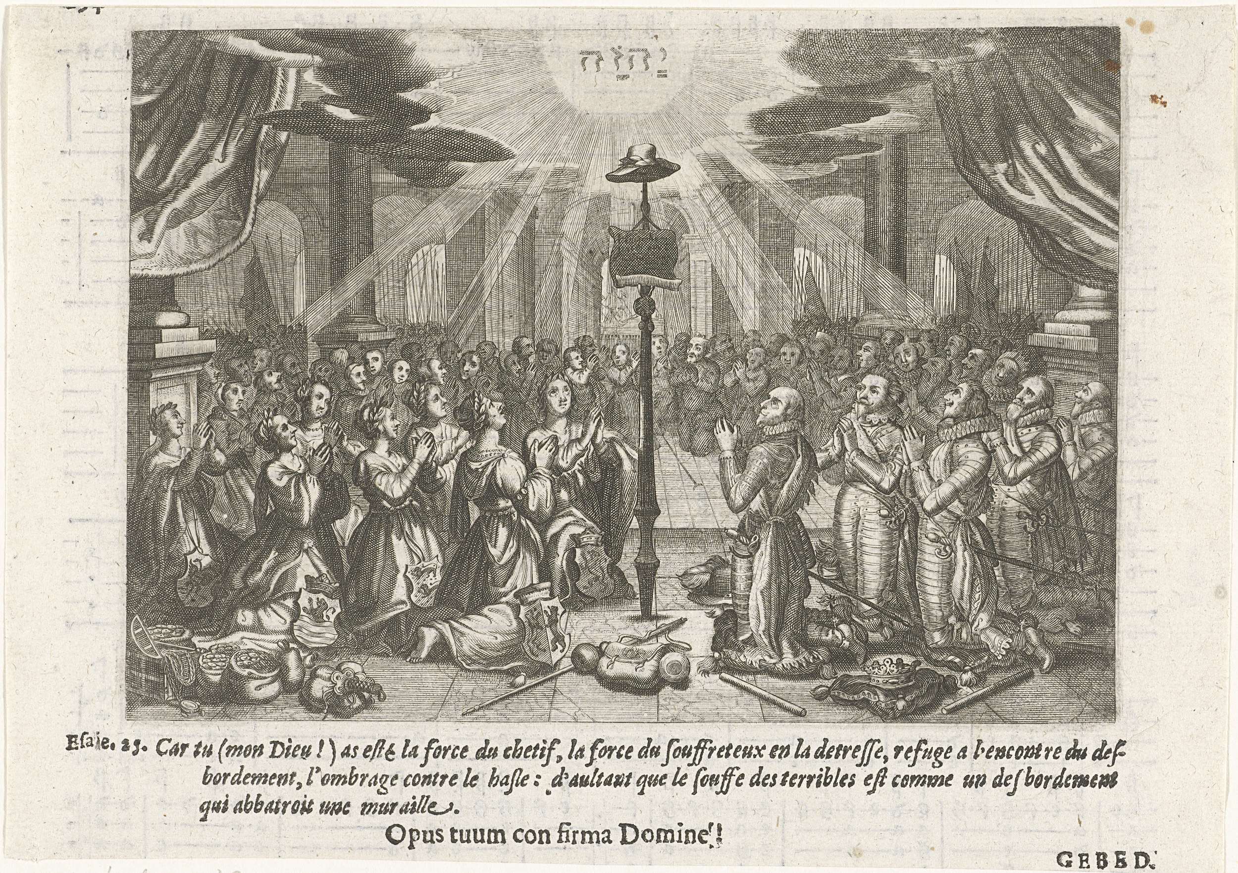 Allegorie op de bereikte vrede in het Bestand, april 1609. De personificaties van de Nederlandse provincies en prins Maurits samen met andere legeraanvoerders knielen in dankbaarheid rond een lans bekroond met de vrijheidshoed. In de hemel het stralende tetragram. Onder de voorstelling een citaat uit het boek Jesaja in het Frans (Jesaja 25:4). Bedrukt op ...
