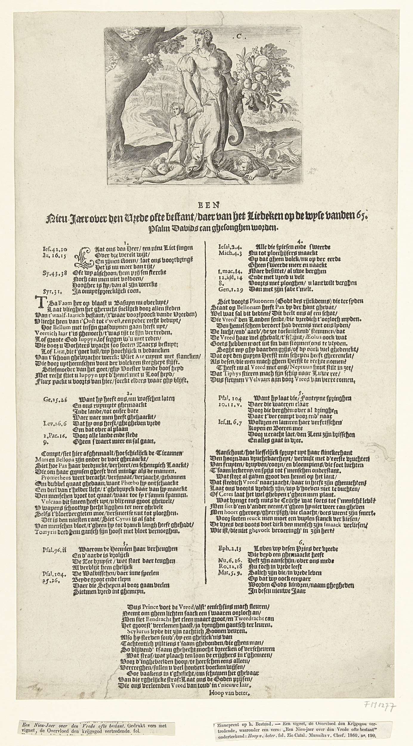 Nieuwjaarsgroet voor vrede dankzij het Twaalfjarig Bestand, ca. 1609-1610. De vrouwelijke personificatie van de Vrede (Pax) met een hoorn van overvloed houdt een jongetje bij de hand, in het vers aangeduid als Plutonem (de god van rijkdom). Zij vertreden samen de Oorlog, in de gedaanten van Mars en Bellona. Gedrukt onder het vignet een lied ...