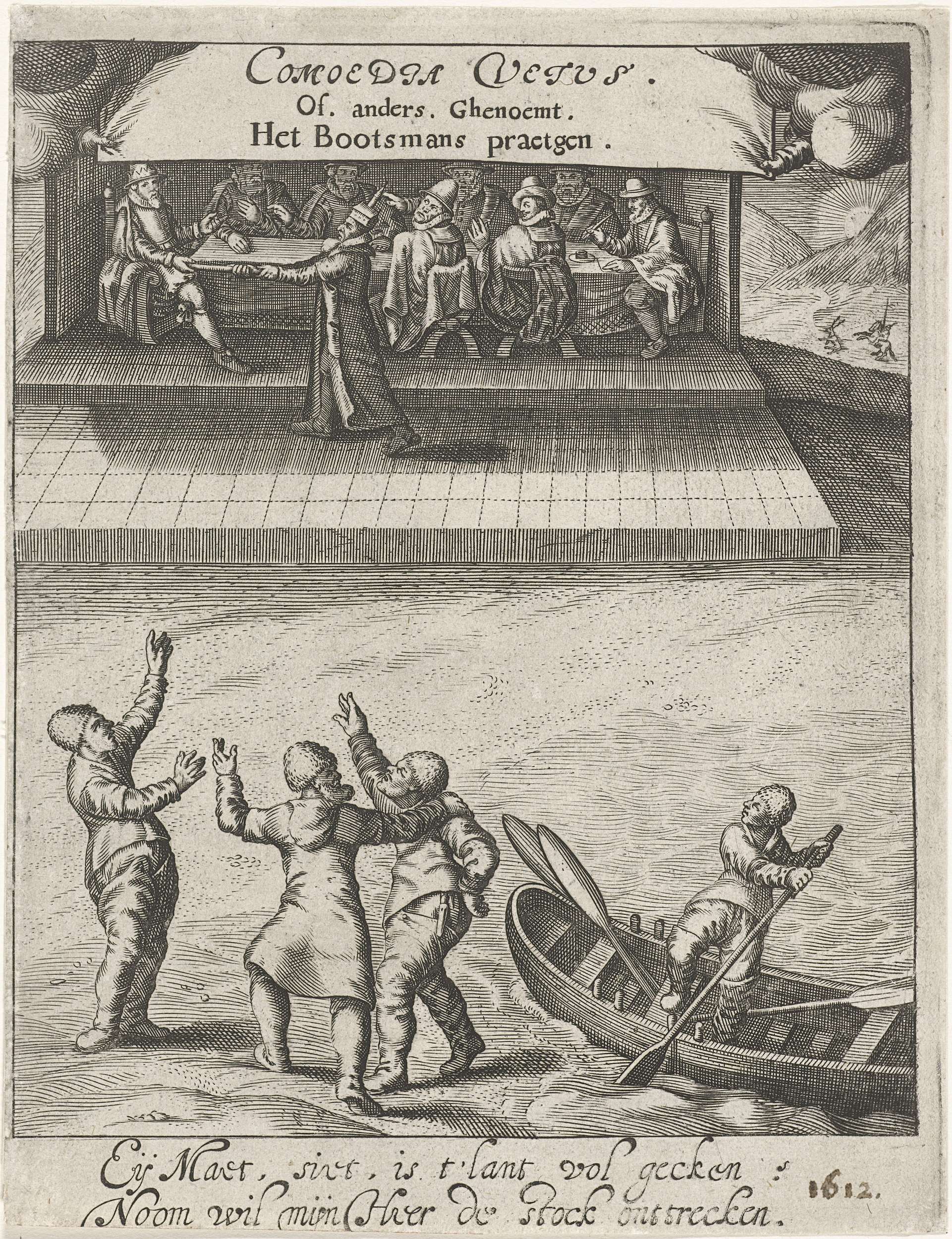 Titelprent van het pamflet Comoedia Vetus, 1612. Bovenaan prins Maurits gezeten aan een tafel met zeven heren. Hij houdt een stok in de hand waarvan een man met een hoofddeksel in de vorm van een kerkgebouw aan het andere eind trekt. Op de voorgrond komen enkele matrozen aan land en wijzen in verbazing naar het ...