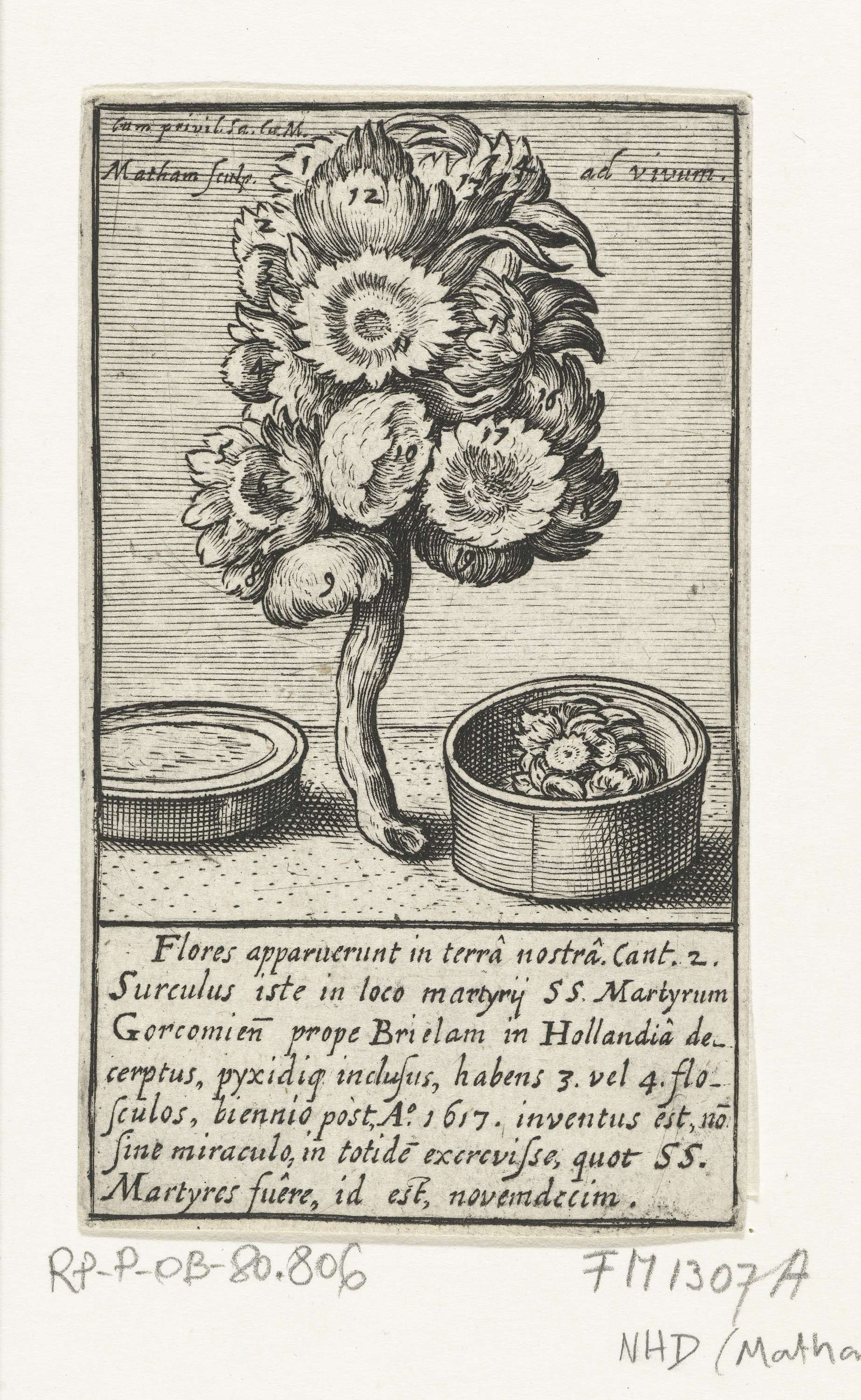 Miraculeuze bloementros met 19 bloemen, evenveel als de martelaren van Gorcum, 1618. Afgebeeld met bijbehorende doos en onderschrift in het Latijn. Onderdeel van een serie uit ca. 1617-1618 van 20 prenten waarvan 19 portretten van de martelaren van Gorcum.