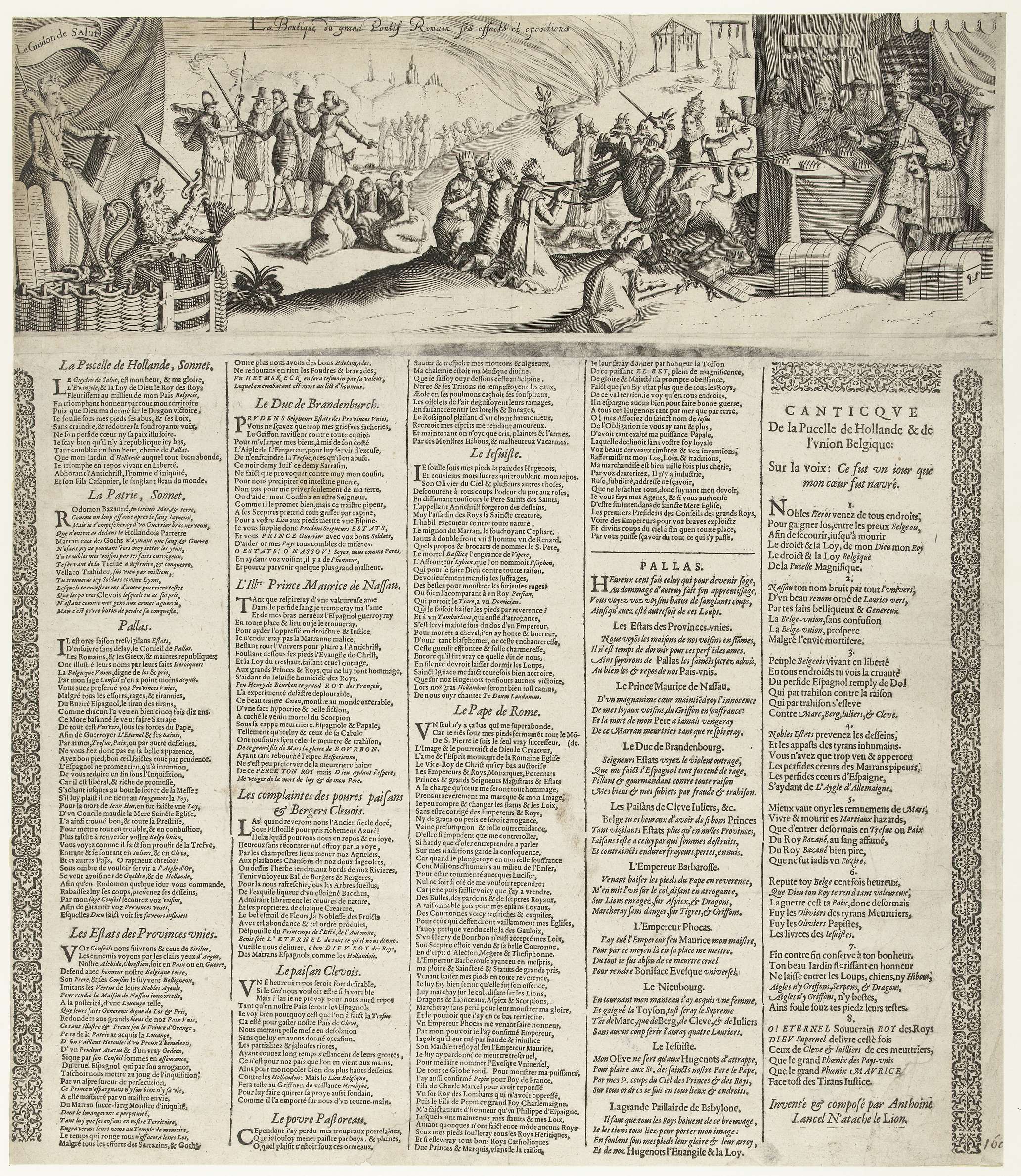De winkel van de paus van Rome, ca. 1615. Allegorie op de onderdrukking door de katholieke kerk. Rechts zit de paus met aan een leiband de zevenkoppige draak met de hoer van Babylon en wereldse vorsten. Op de achtergronden ketterverbrandingen en terechtstellingen. Bij de voeten van de paus knielt keizer Barbarossa. Links de Nederlandse Maagd ...