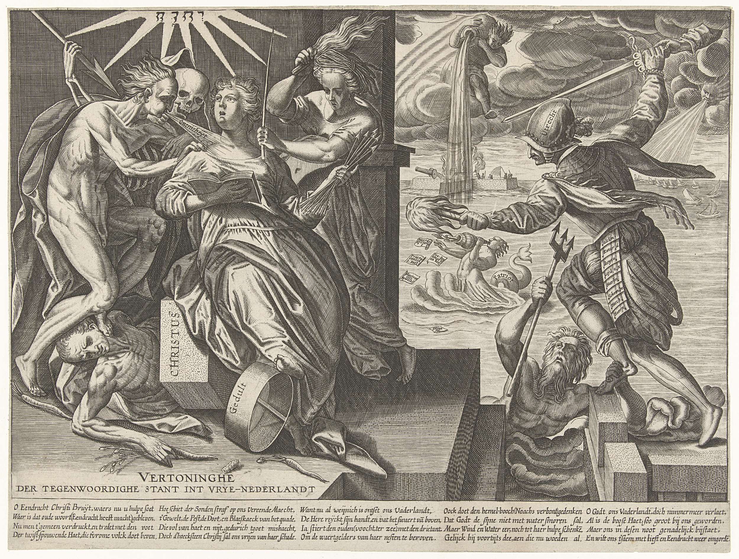 Allegorie op de bestandstwisten, 1618. De Nederlandse Maagd wordt aangevallen door een soldaat gemerkt op zijn helm als Utrecht (waardgelder) met aan zijn rok de namen van de remonstrantse steden in Holland. Zijn opgeheven hand met zwaard wordt door de hand van God uit de hemel tegen gehouden. De maagd zit op de hoeksteen Christus ...