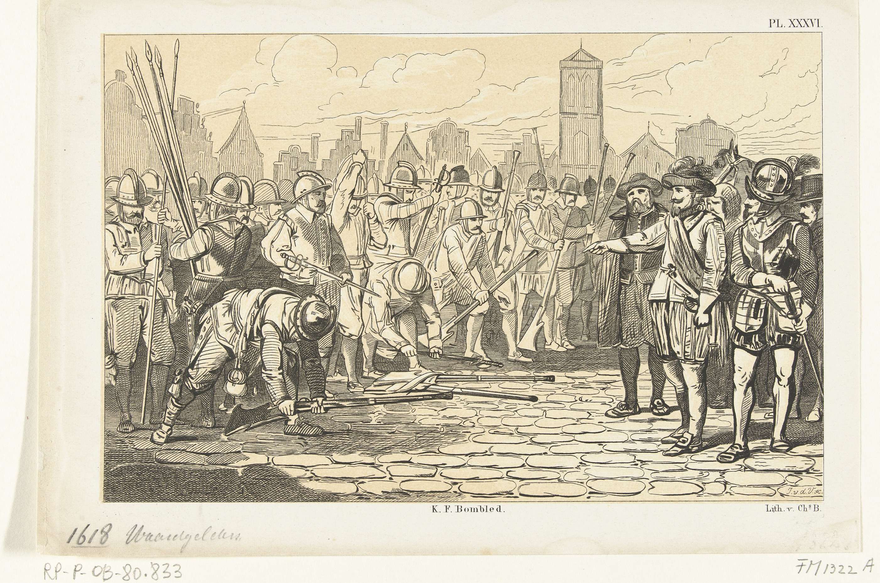 De afdanking van de waardgelders op bevel van prins Maurits, 31 juli 1618. De soldaten leggen hiertoe bevolen door prins Maurits hun wapens op de grond. Rechts de prins, staand en wijzend.