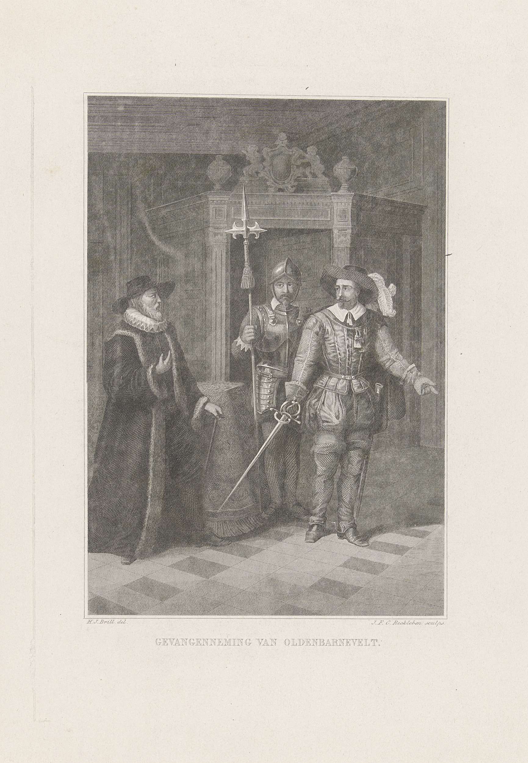 Gevangenneming van Johan van Oldenbarnevelt, 29 augustus 1618. De raadspensionaris wordt door twee soldaten gearresteerd.