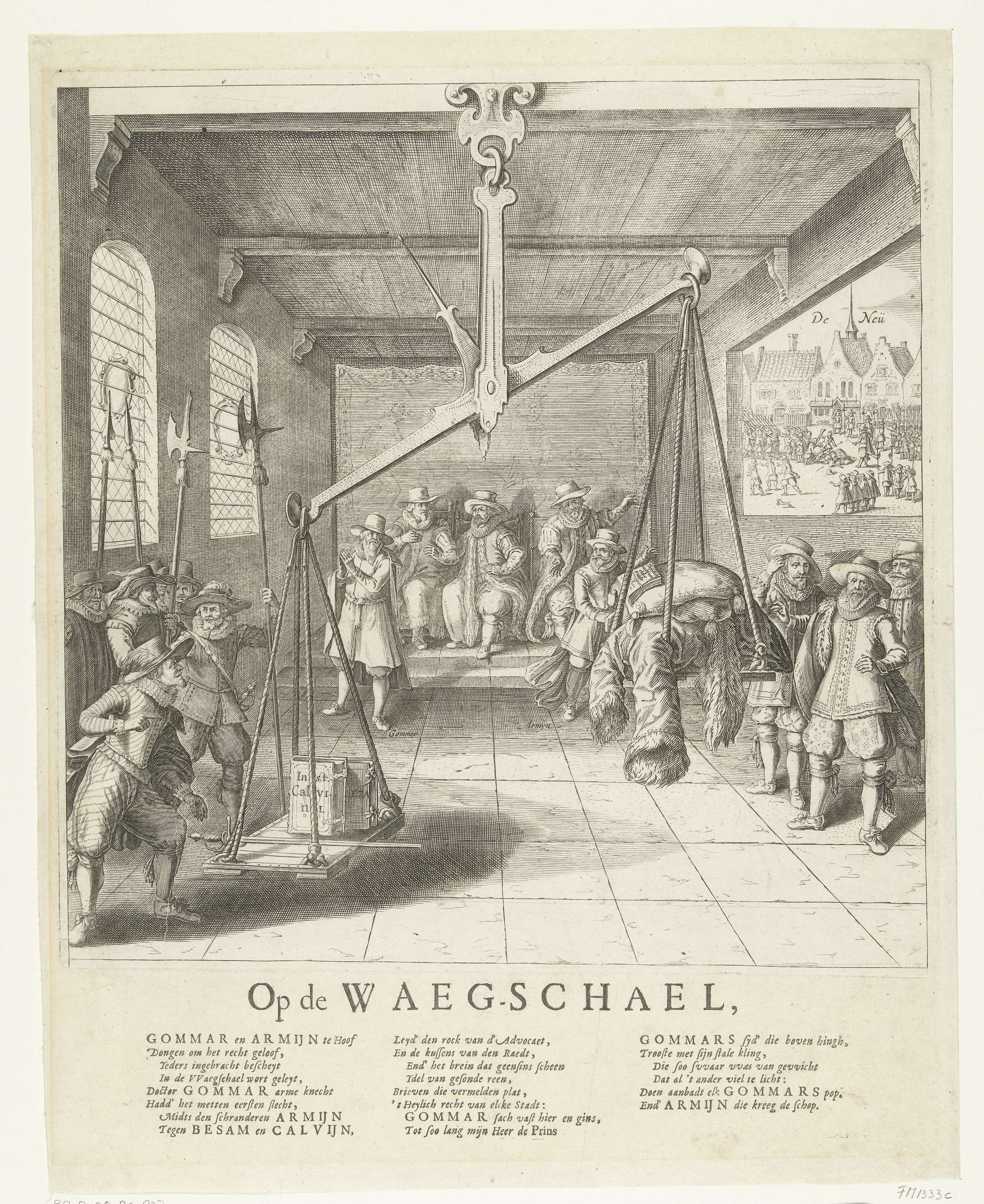 Politieke allegorie op de overwinning van de contraremonstranten dankzij het ingrijpen van prins Maurits, 1618. De voorstelling toont een interieur met een grote weegschaal. Hierop worden, in aanwezigheid van Gomarus, Arminius, Johan van Oldenbarnevelt en anderen, de argumenten van de contraremonstranten en de remonstranten tegen elkaar afgewogen. Maurits doet de balans ten gunste van de ...