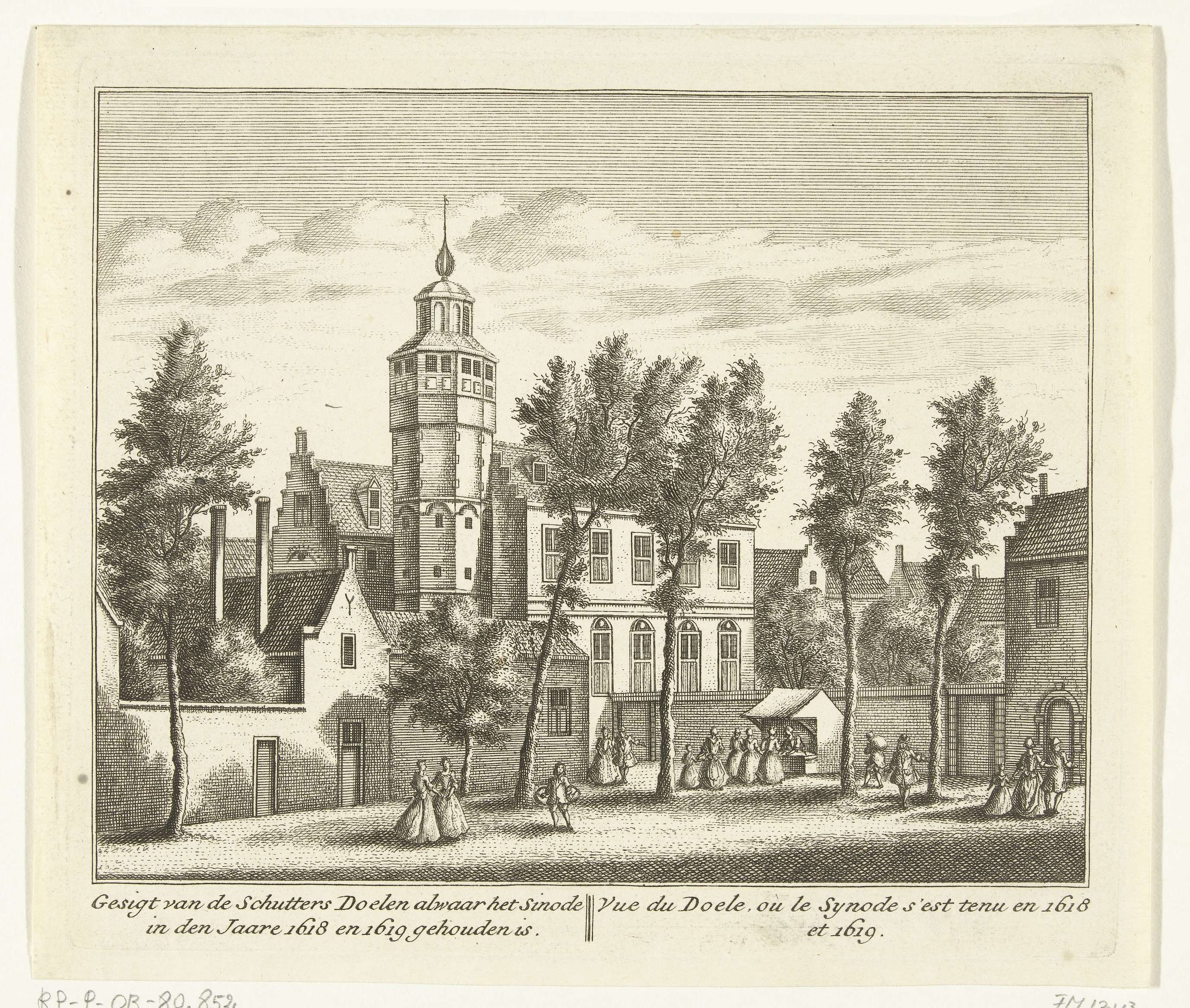 Gezicht op de Kloveniersdoelen te Dordrecht waar de Nationale Synode is gehouden in de jaren 1618-1619 (Synode van Dordrecht). Op de voorgrond een kraampje en enkele voorbijgangers.