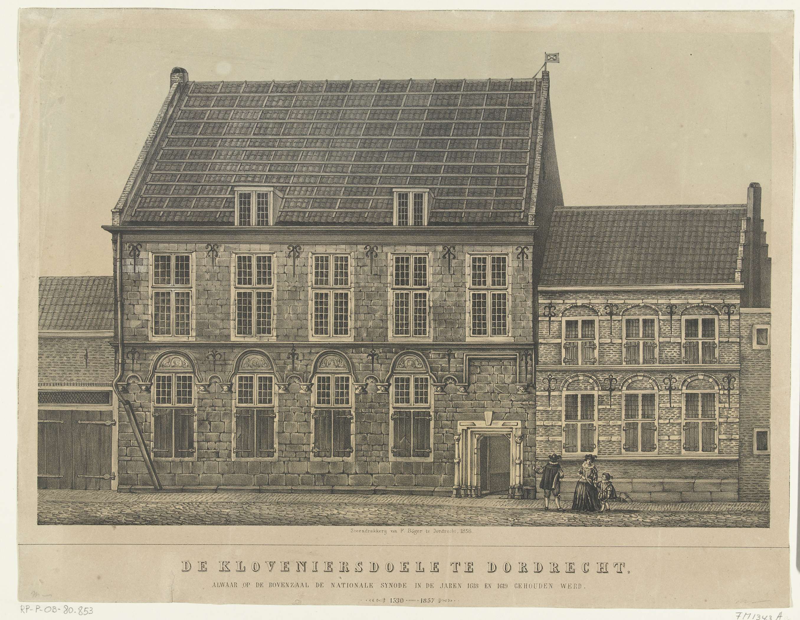 Gezicht op de Kloveniersdoelen te Dordrecht waar de nationale synode is gehouden in de jaren 1618-1619. op de voorgrond een kraampje en enkele voorbijgangers.