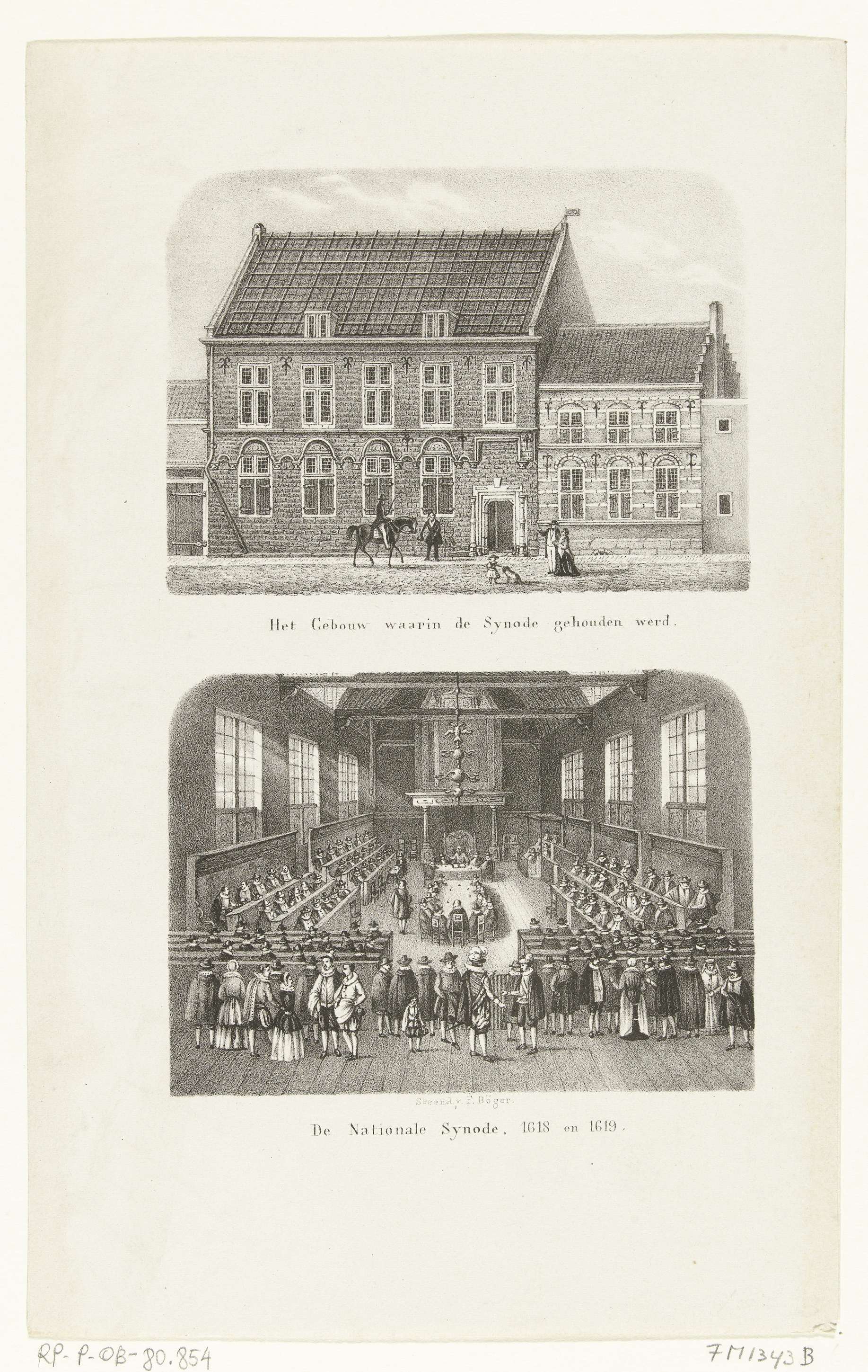 Twee voorstellingen op één blad. Boven: gezicht op de Kloveniersdoelen te Dordrecht waar de nationale synode is gehouden in de jaren 1618-1619, bij de ingang enkele voorbijgangers. Onder: zitting van de nationale synode in de bovenzaal van de Kloveniersdoelen te Dordrecht in 1618-1619 naar het schilderij in het stadhuis.