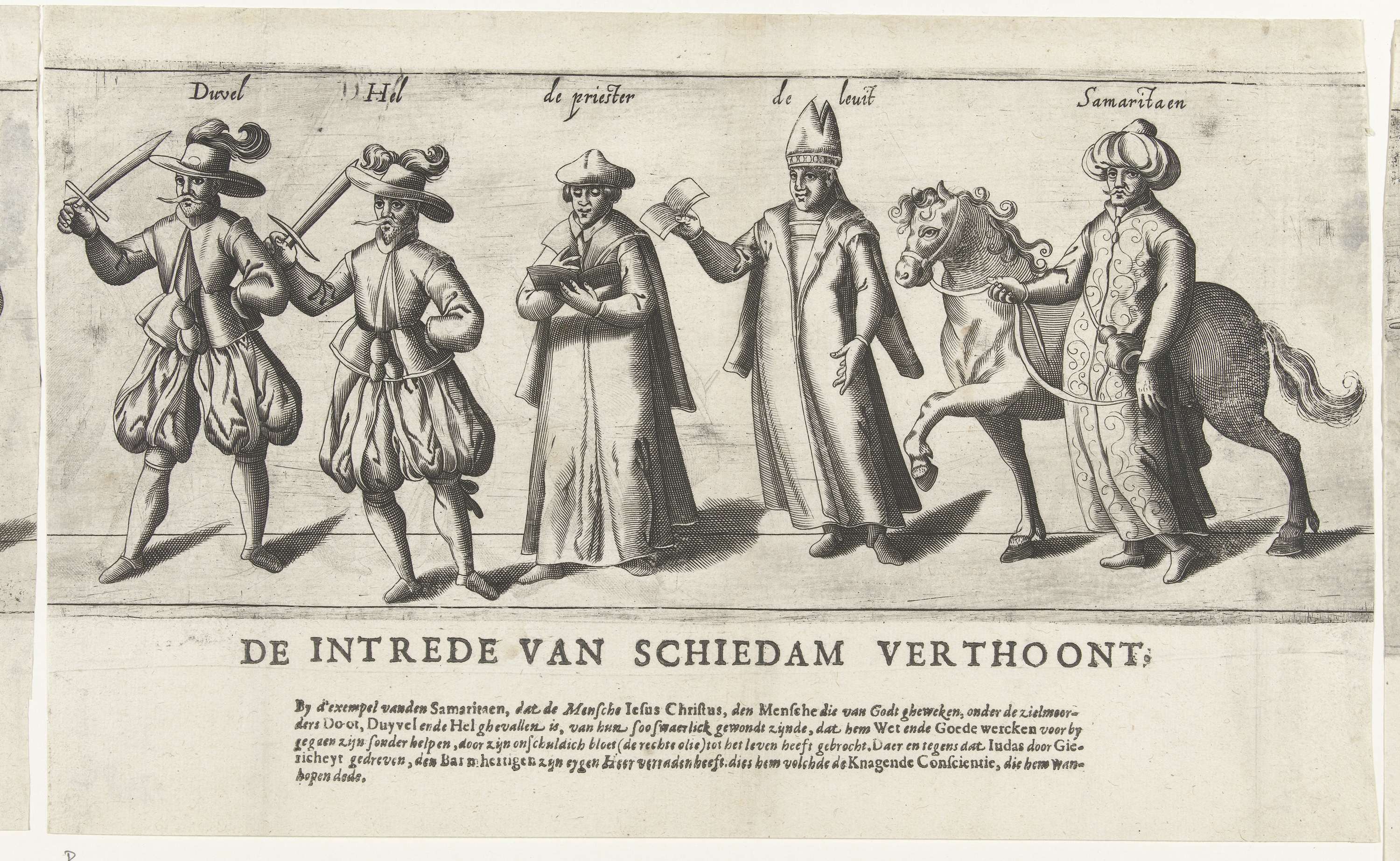 Optocht door de rederijkerskamer De Roo Roosen uit Schiedam, op het rederijkersfeest van 22 oktober 1607 te Haarlem. Tweede deel: optocht van vijf figuren uit de parabel van de Barmhartige Samaritaan.