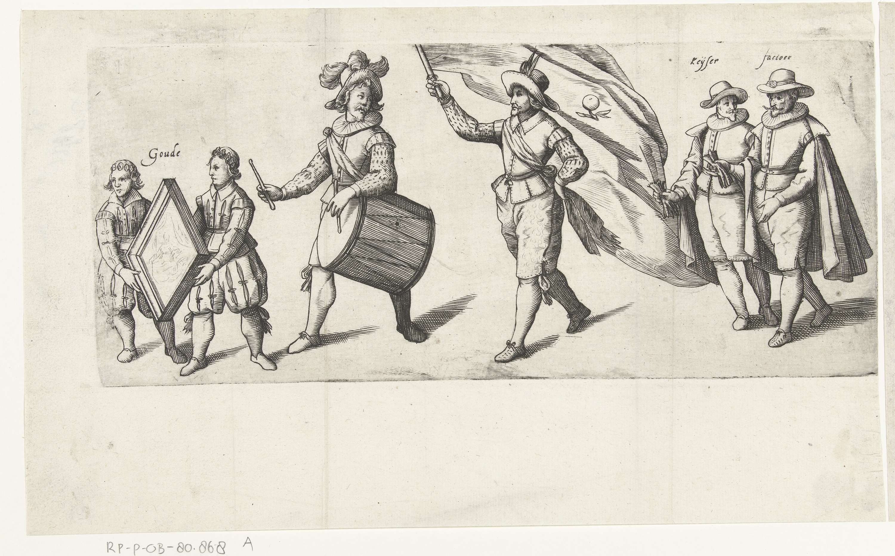 Optocht door de rederijkerskamer De Goudsbloem uit Gouda, op het rederijkersfeest van 22 oktober 1607 te Haarlem. Eerste deel: optocht van de blazoendragers, tamboer, vaandeldrager, keizer en factoor.