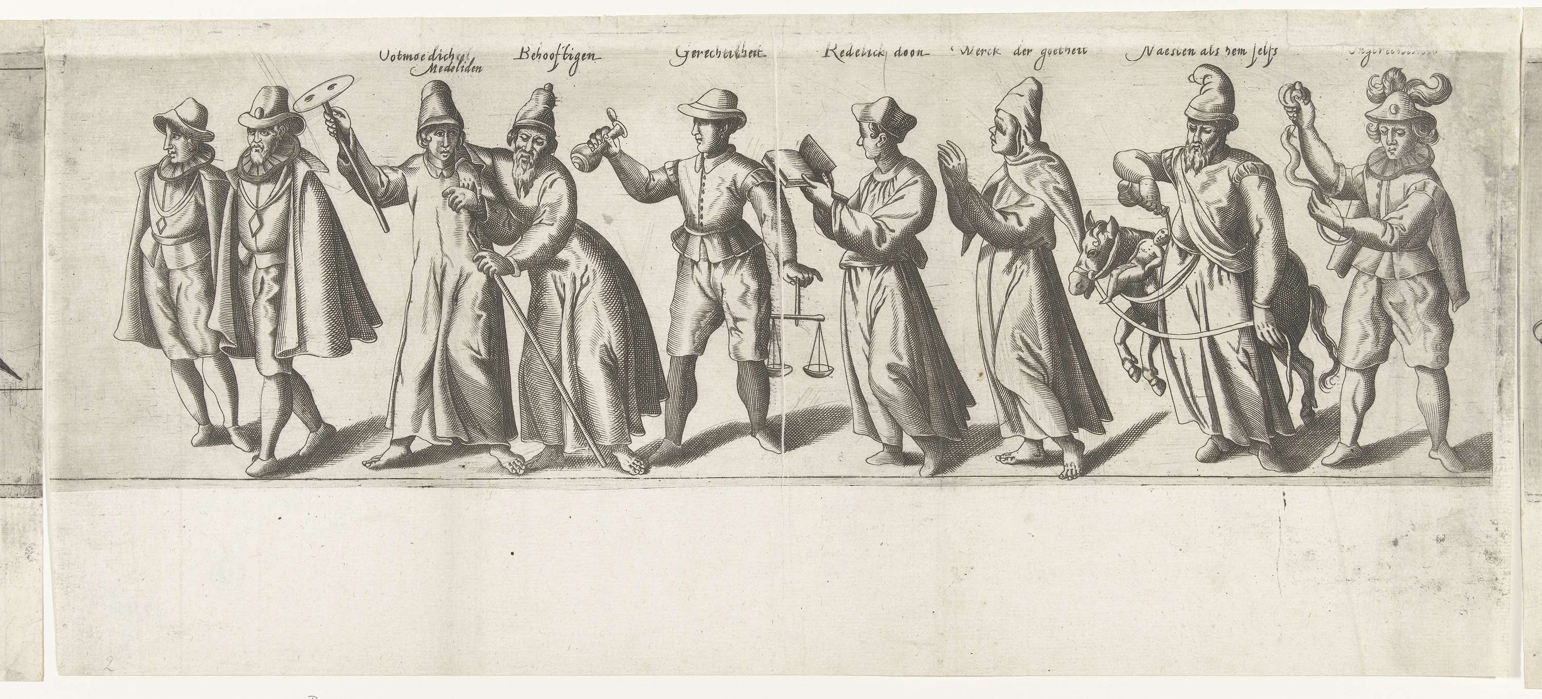 Optocht door de rederijkerskamer De Sonnebloem uit Kethel, op het rederijkersfeest van 22 oktober 1607 te Haarlem. Tweede deel: optocht van twee mannen gevolgd door zeven allegorische figuren.