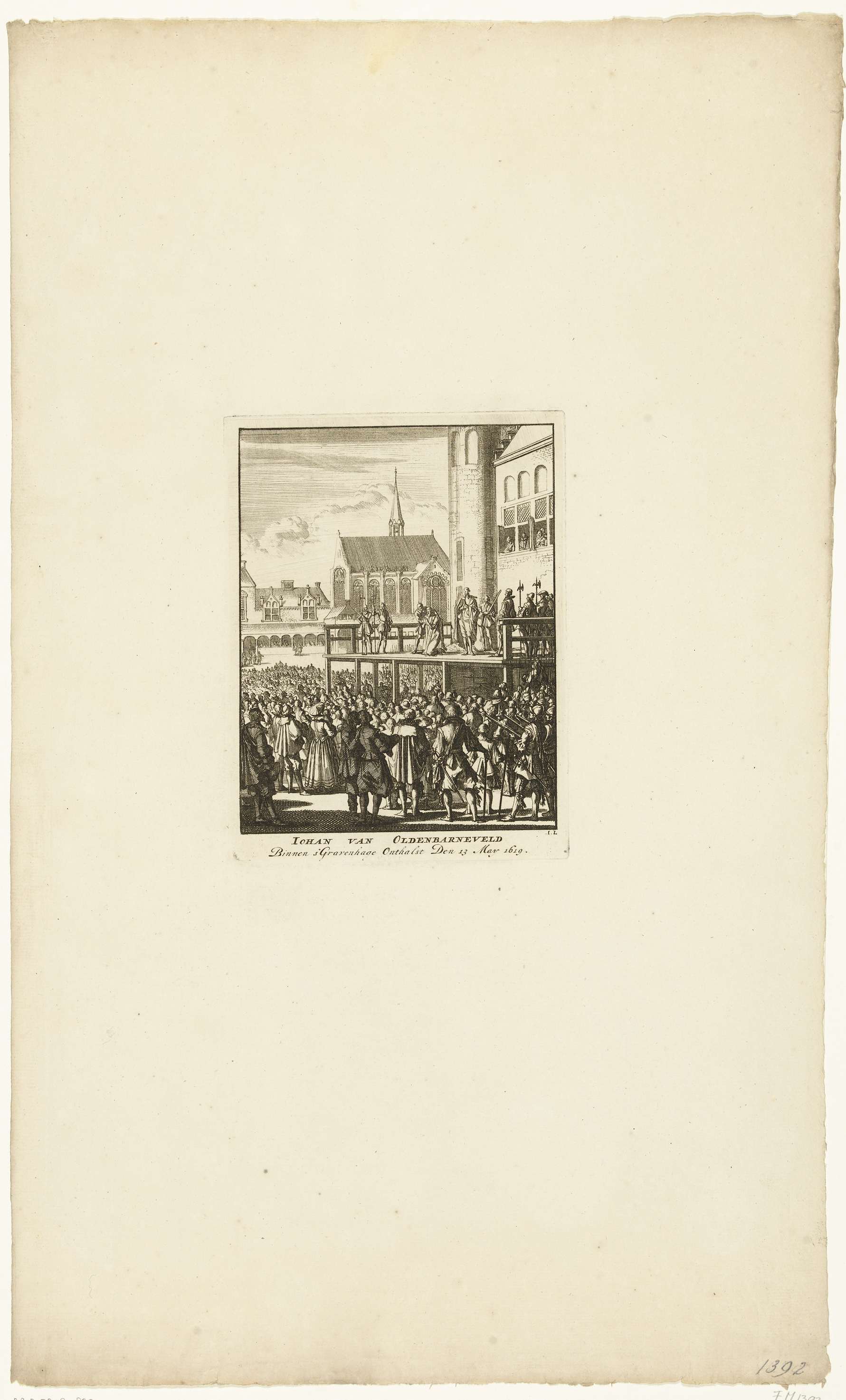 Johan van Oldenbarnevelt knielt voor zijn onthoofding op het Binnenhof te Den Haag op 13 mei 1619. Zijn knecht Jan Francken staat aan zijn zijde op het schavot, een predikant houdt een gebed. Op het plein de verzamelde toeschouwers.