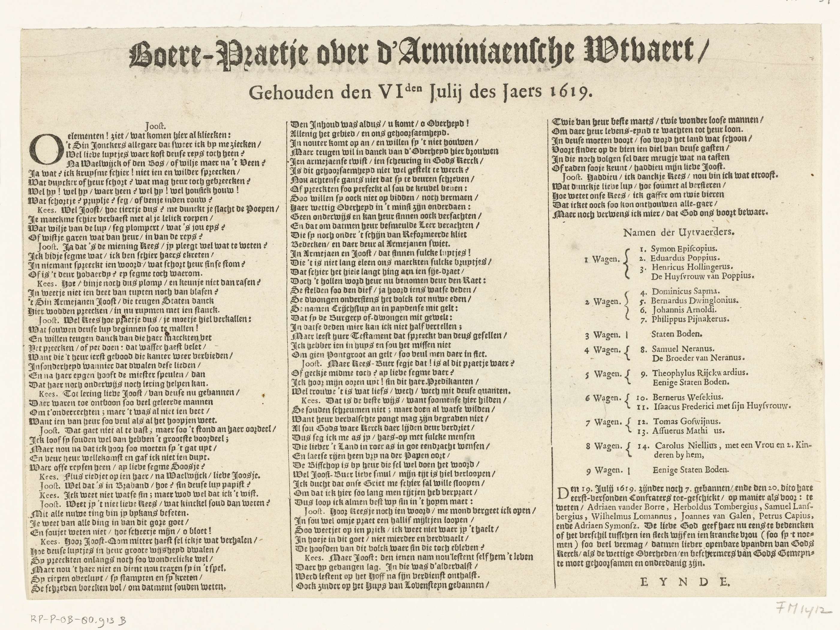 Tekstblad behorend bij de spotprent op de uittocht van de remonstranten uit 's-Gravenhage op 6 juli 1619 na de veroordeling door de Synode. Tekst in 3 kolommen.