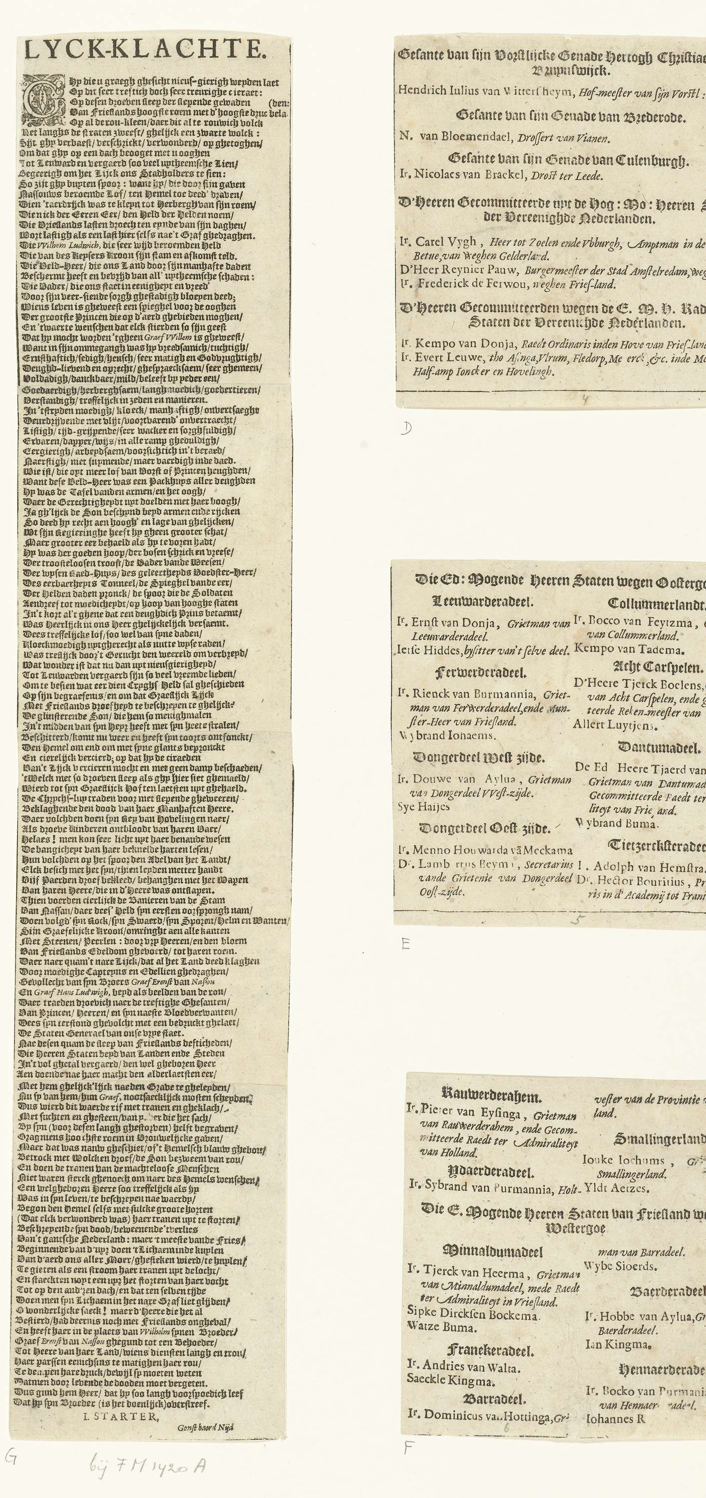 Tekstblad met de lijkklacht bij de begrafenis van Willem Lodewijk, graaf van Nassau, in de Grote Kerk te Leeuwarden op 13 juli 1620. Vers in één kolom bestaande uit vier aan elkaar geplakte delen.
