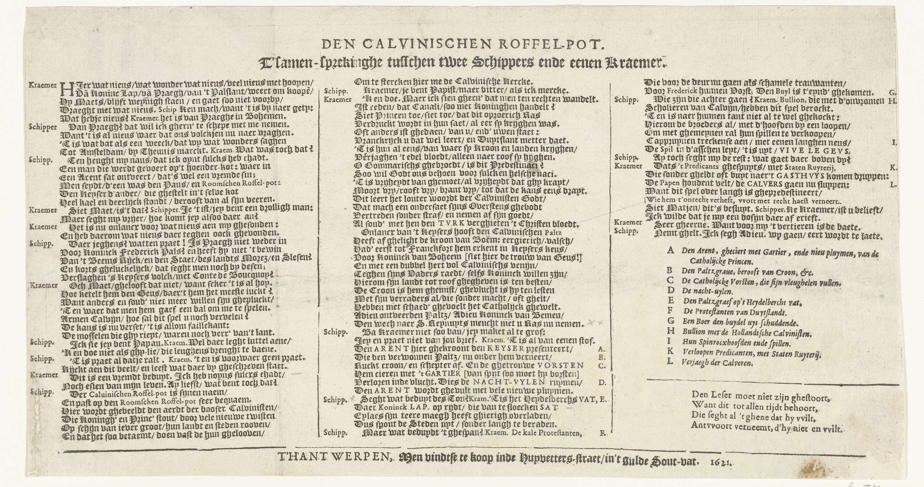 De Calvinistische Roffelpot. Tekstblad bij een spotprent op de nederlaag van Frederik van Bohemen in de slag op de Witte Berg bij Praag, 8-9 november 1620. Drie kolommen tekst met een samenspreking tussen twee schippers en een kramer en de legenda A-L. Tegenhanger van de Roomse Roffelpot (FMH 1422 en 1423).