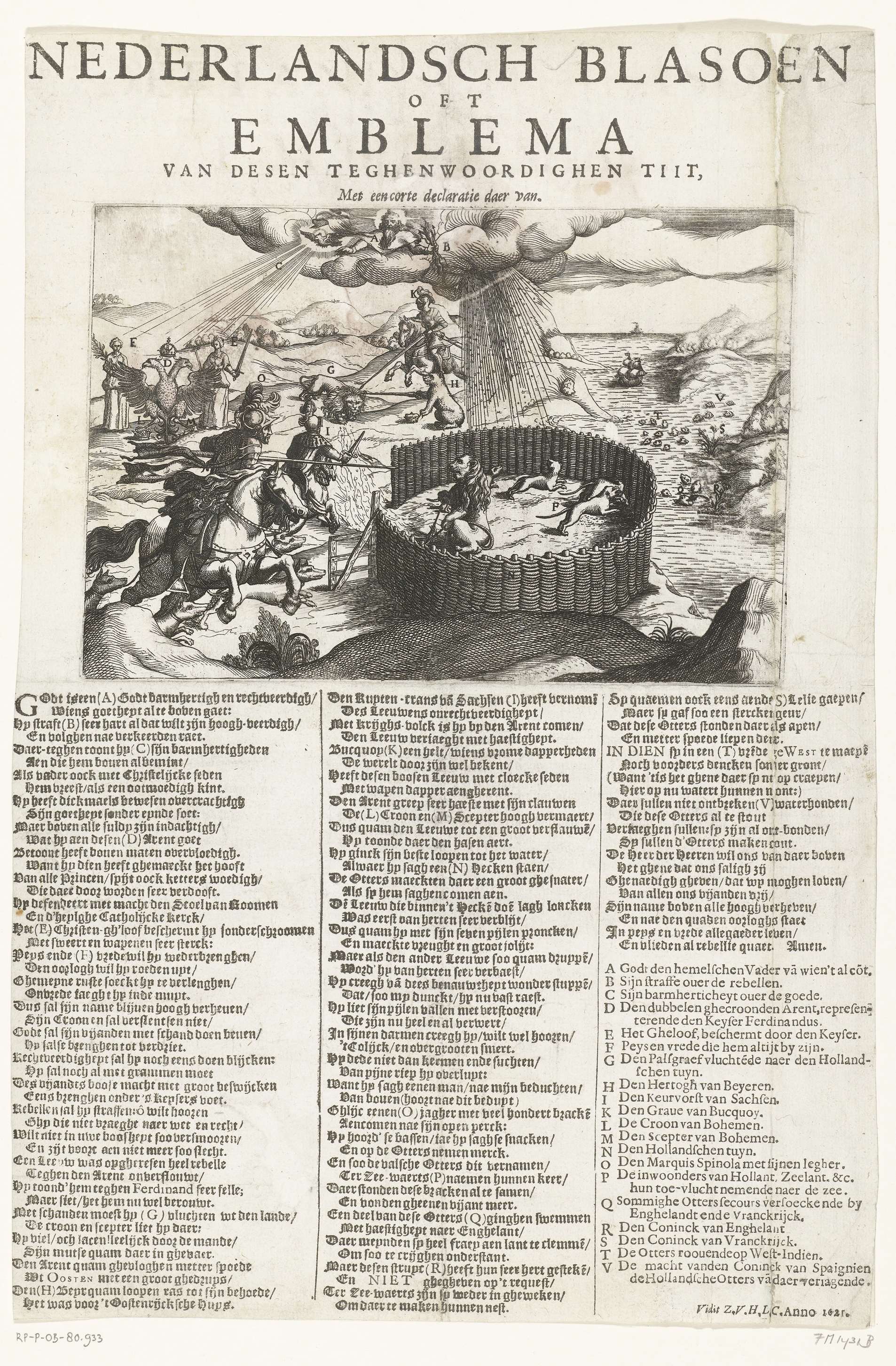 Spotprent op de nederlaag van Frederik van Bohemen en de in Nederland gezochte steun, 1620. De Nederlandse Leeuw wordt in de Hollandse Tuin gehouden door Spinola te paard. Op de achtergrond de Boheemse leeuw die naar Nederland wil vluchten. Links op de achtergrond baadt de Duitse adelaar met Vrede en Geloof in het hemelse licht. ...