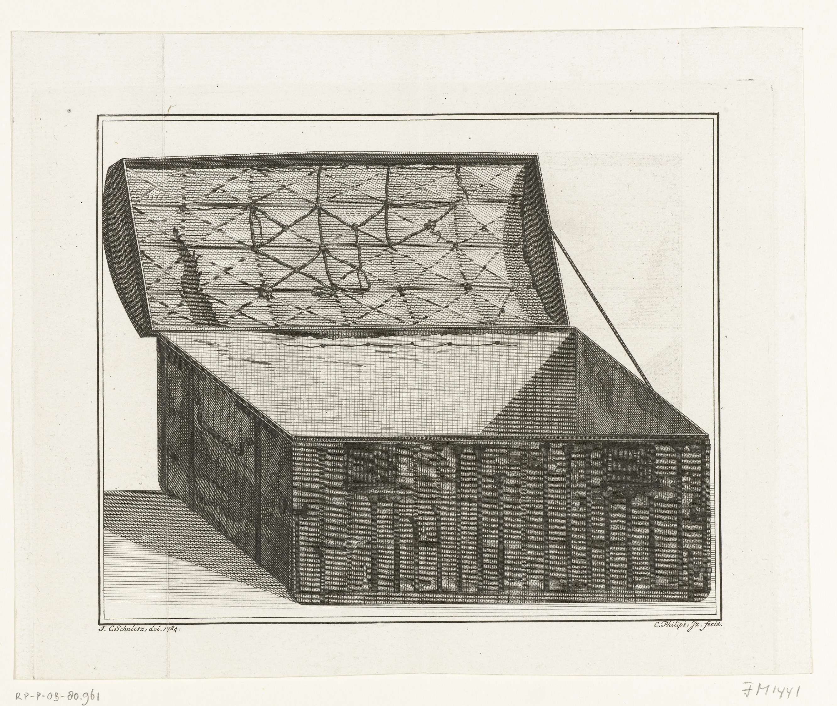 De boekenkist waarin Hugo de Groot uit Slot Loevestein ontsnapt is op 22 maart 1621. Afbeelding van de kist met open deksel, in 1783 in het bezit van Mr. Jacob Klinkhamer te Amsterdam.