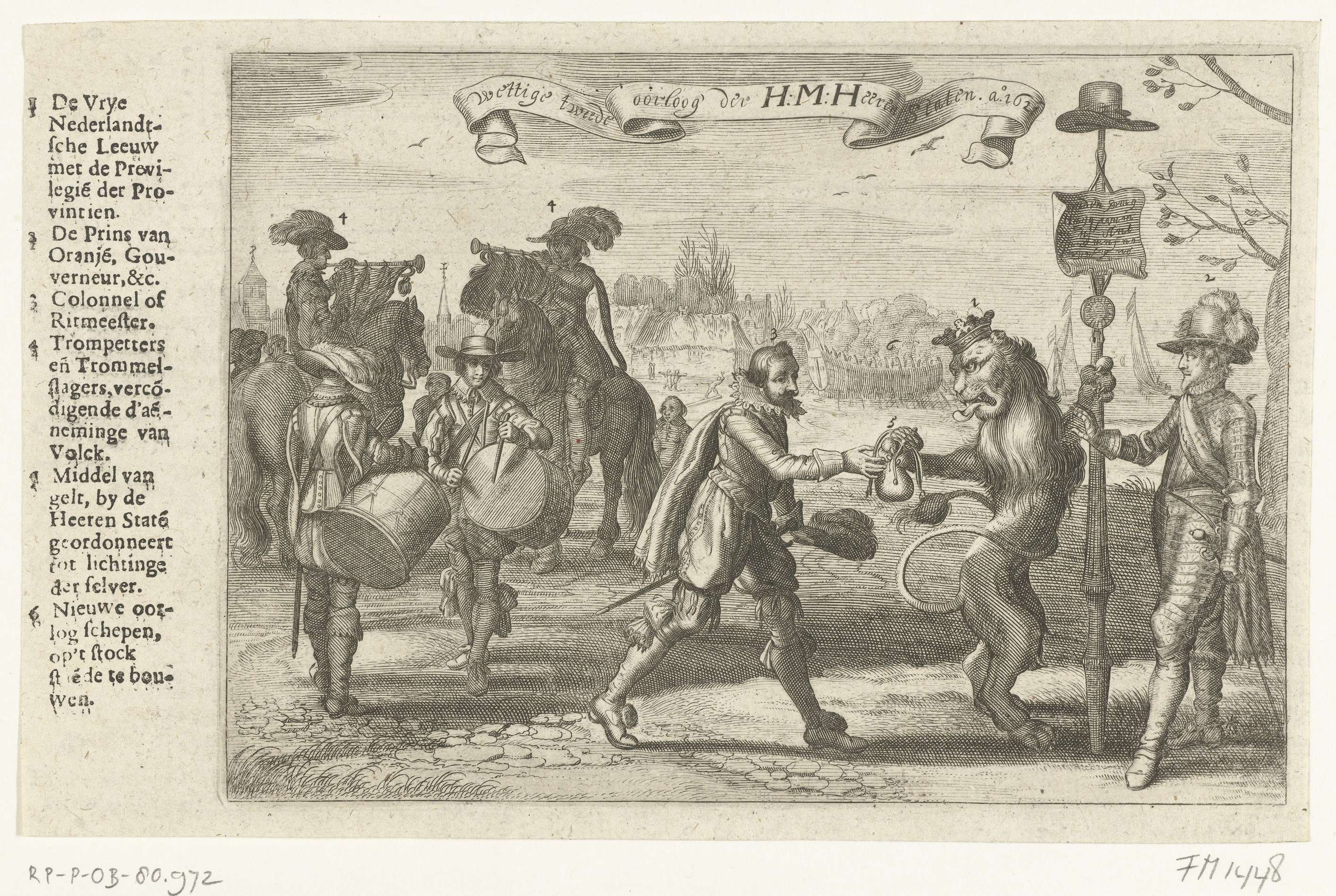 Allegorie op het einde van het Twaalfjarig Bestand en het hervatten van de oorlog, 10 april 1621. De Nederlandse Leeuw overhandigt de militairen het geld om de strijd te hervatten en nieuwe schepen te bouwen, rechts prins Maurits. Links de legenda 1-6. Bedrukt op achterzijde met tekst en muziek.