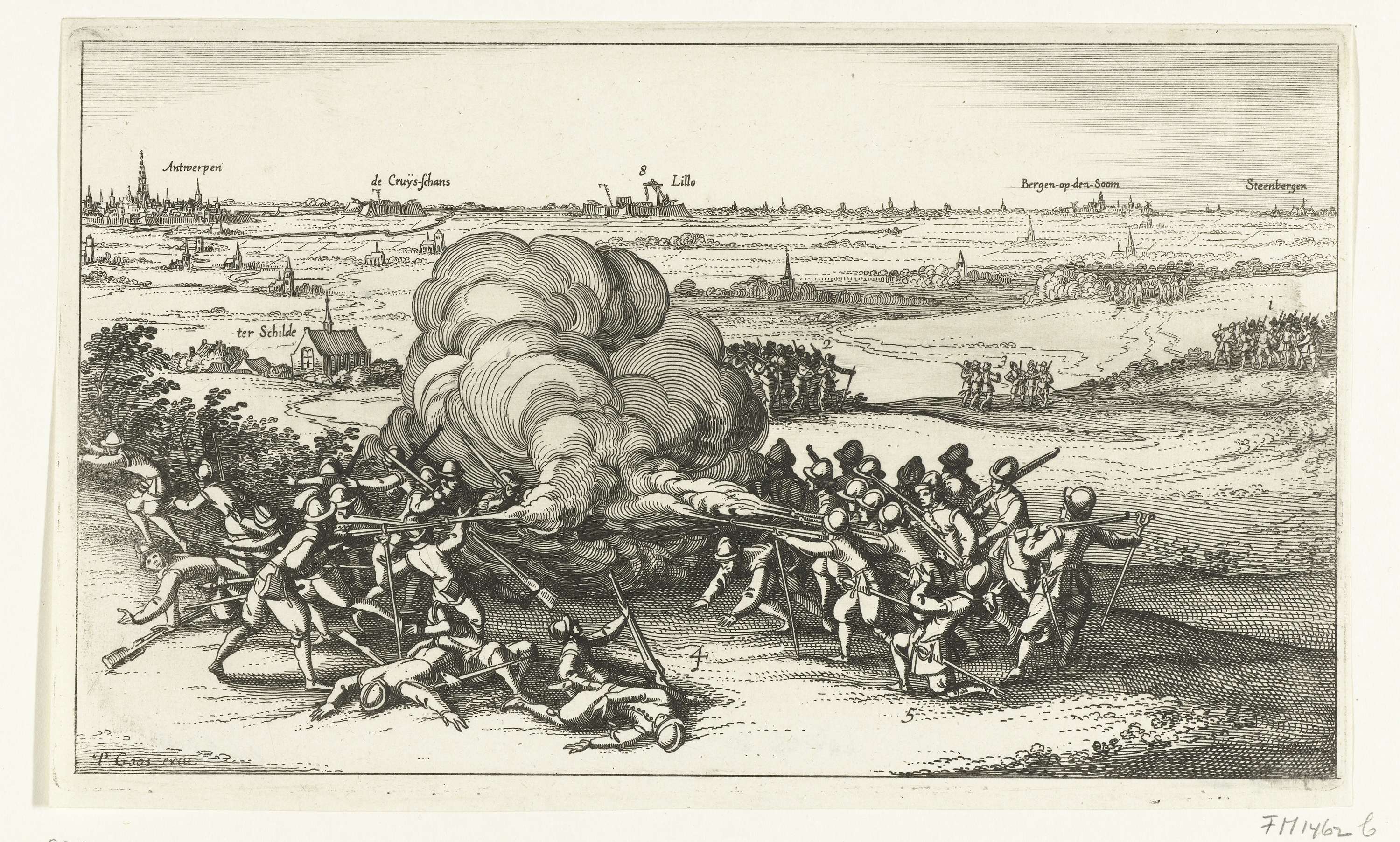 Schermutseling in juni 1622, tussen 15 Staatse en 16 vijandelijke soldaten, bij het dorp Ter Schilde in de omgeving van Antwerpen. Details in de voorstelling zijn genummerd, maar de legenda ontbreekt.