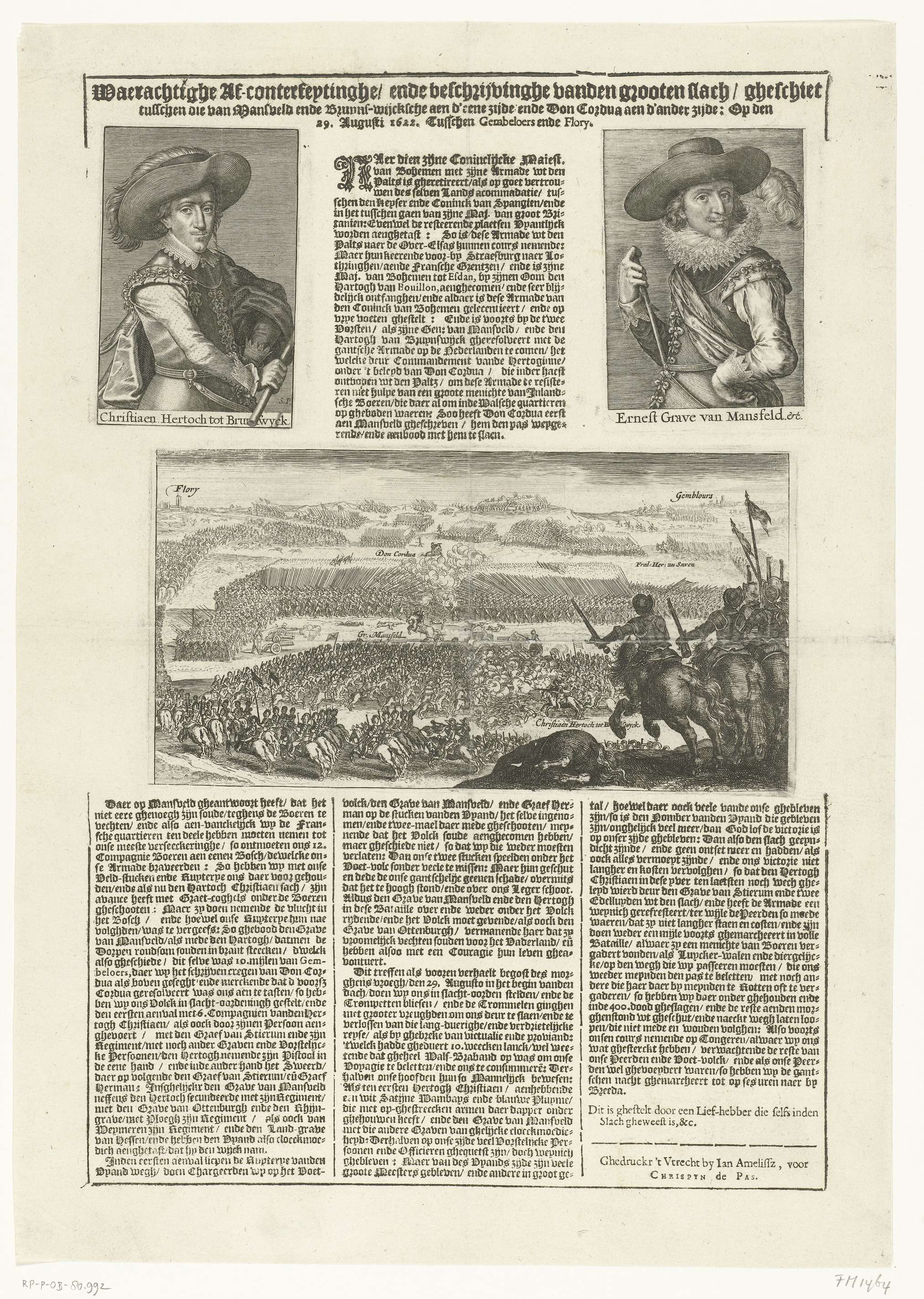 Slag bij Fleurus in Henegouwen tussen het leger onder Christiaan hertog van Brunswijk en Ernst graaf van Mansfeld tegen het Spaanse leger onder Gonzalo Fernández de Córdoba, 29 augustus 1622. Met bovenaan twee portretten van Brunswijk en Mansfeld en daaronder een plaat van de veldslag. Hiertussen 3 kolommen tekst in het Nederlands.
