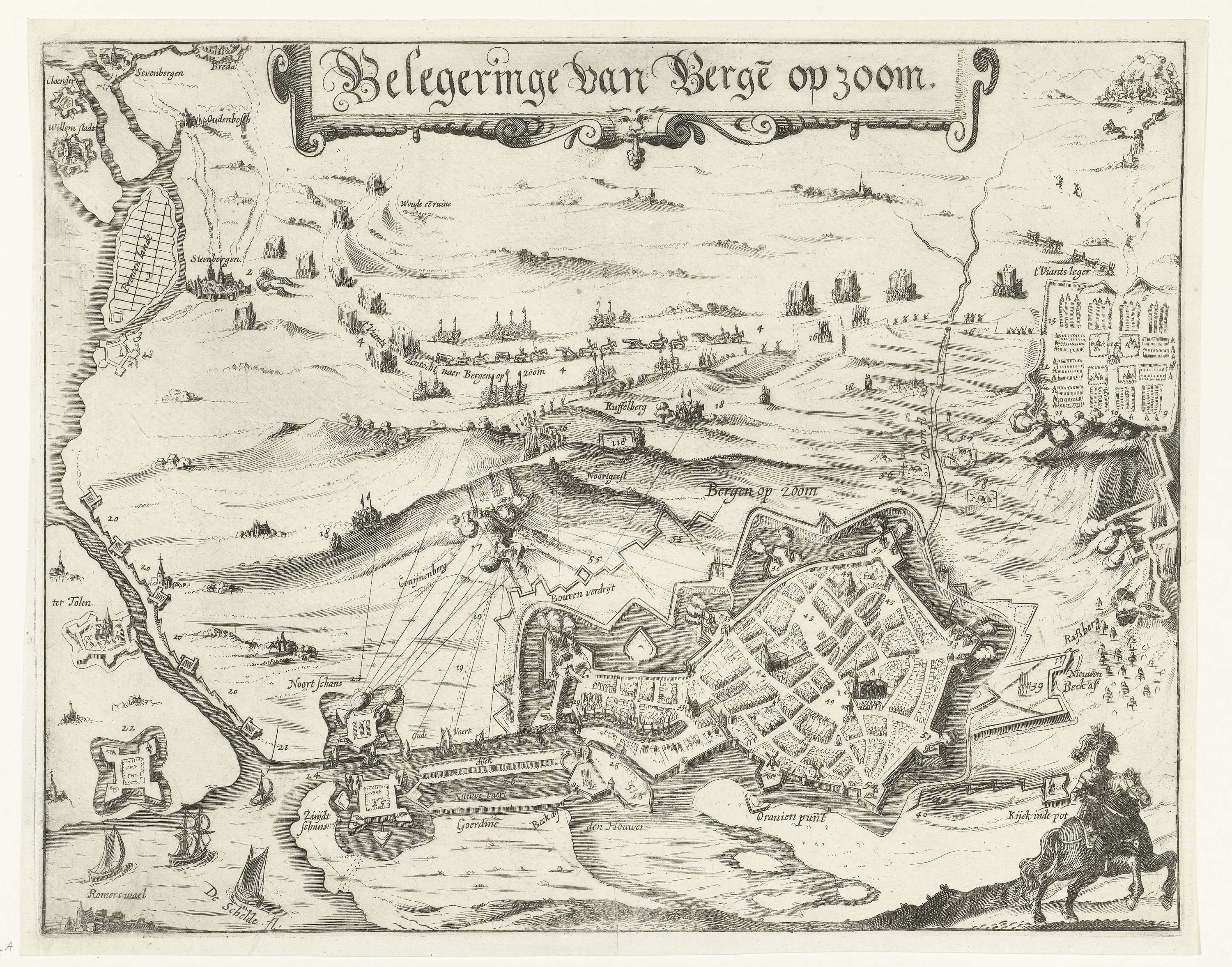 Mislukt beleg van Bergen op Zoom door het Spaanse leger onder Spinola en Velasco, 18 juli - 3 oktober 1622. Plan van de stad en omgeving, op de voorgrond een ruiter. Boven de aantocht van het Spaanse leger, rechts de legerplaats. Zie ook het bijbehorende tekstblad.
