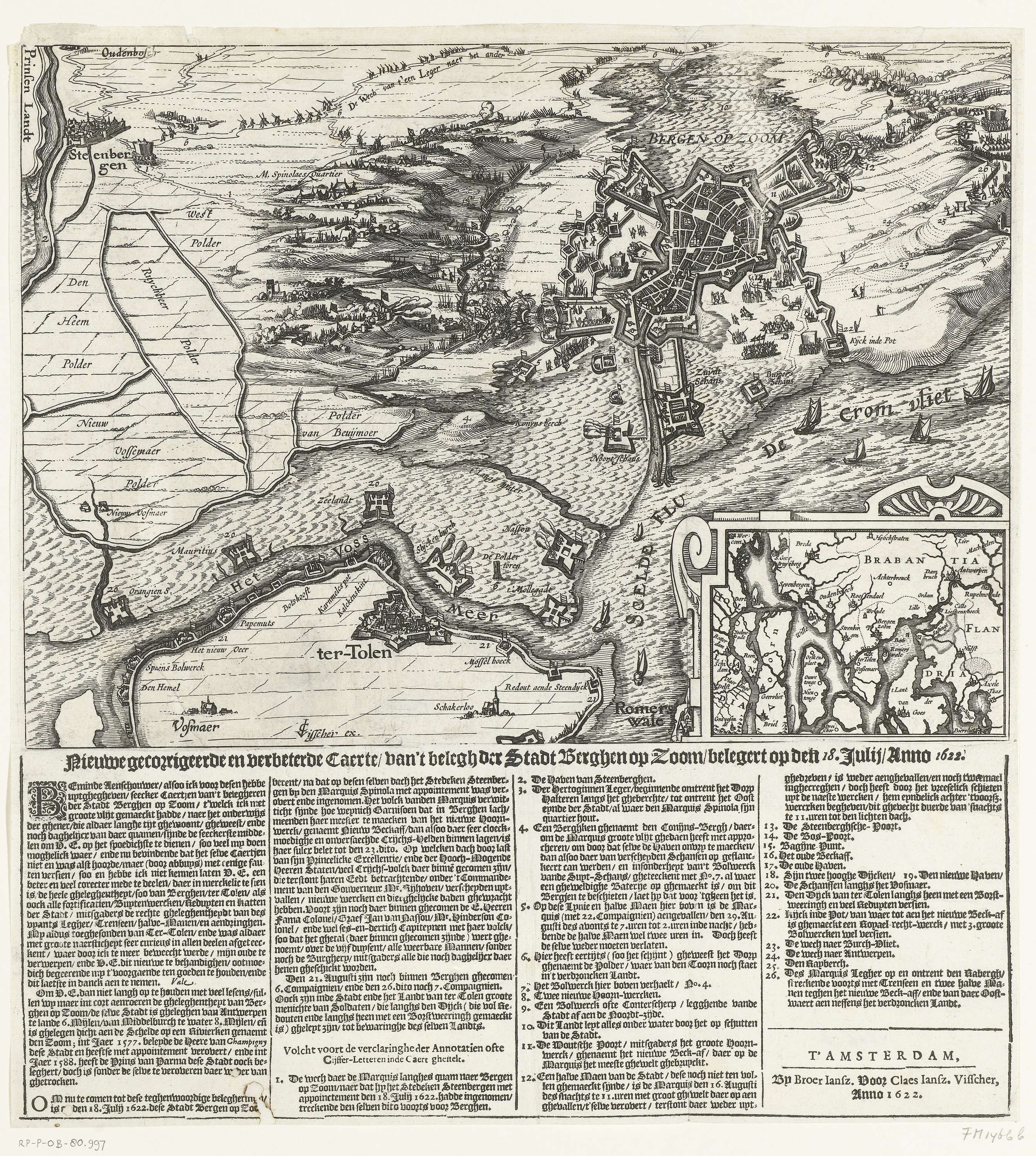 Mislukt beleg van Bergen op Zoom door het Spaanse leger onder Spinola en Velasco, 18 juli - 3 oktober 1622. Plan van de stad en omgeving met waterwegen. Rechtsonder een cartouche met het groter gebied in Brabant en Vlaanderen. Onder de voorstelling geplakt een tekst in 4 kolommen met een beschrijving van het beleg en ...