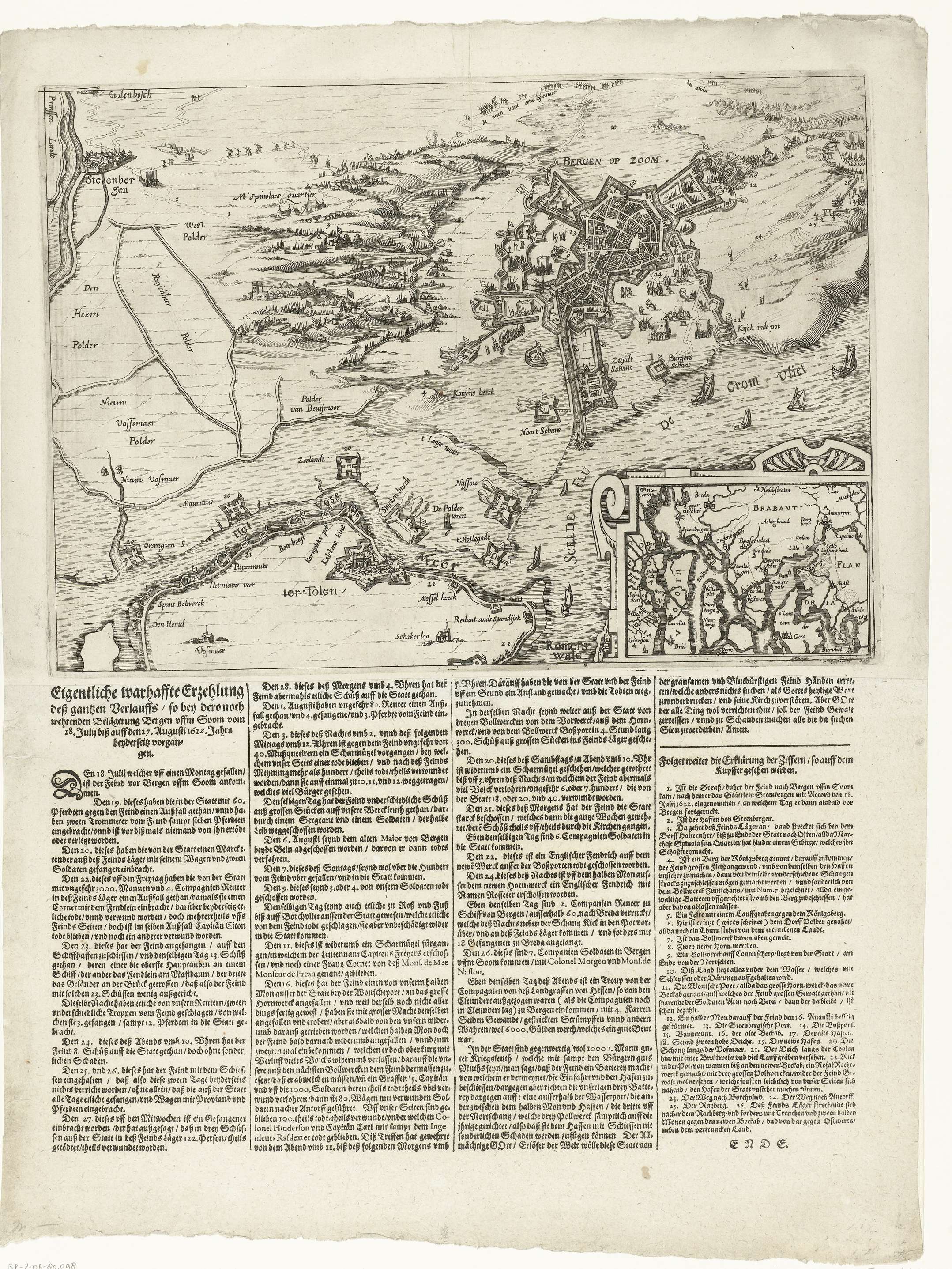 Mislukt beleg van Bergen op Zoom door het Spaanse leger onder Spinola en Velasco, 18 juli - 3 oktober 1622. Plan van de stad en omgeving met waterwegen. Rechtsonder een cartouche met het groter gebied in Brabant en Vlaanderen. Onder de voorstelling geplakt een tekst in 4 kolommen met een beschrijving van het beleg en ...