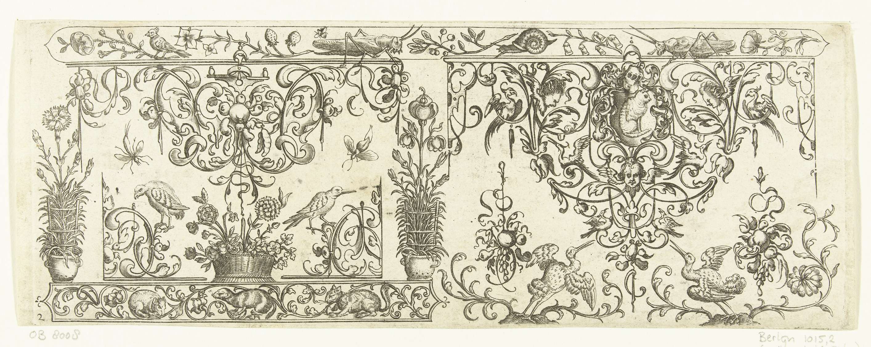 Tegenzijdige kopie naar prenten (blad 10 en 4) uit de serie Somige Eenvoldige Vruchten en Spitsen. Links staat midden onder een mand met bloemen tussen twee vogels, rechtsboven is een kat afgebeeld. Uit serie bladen waarop telkens twee motieven naast elkaar te zien zijn, aangevuld met vogels, insecten, bloempotten en soms een ornamentele rand met ...