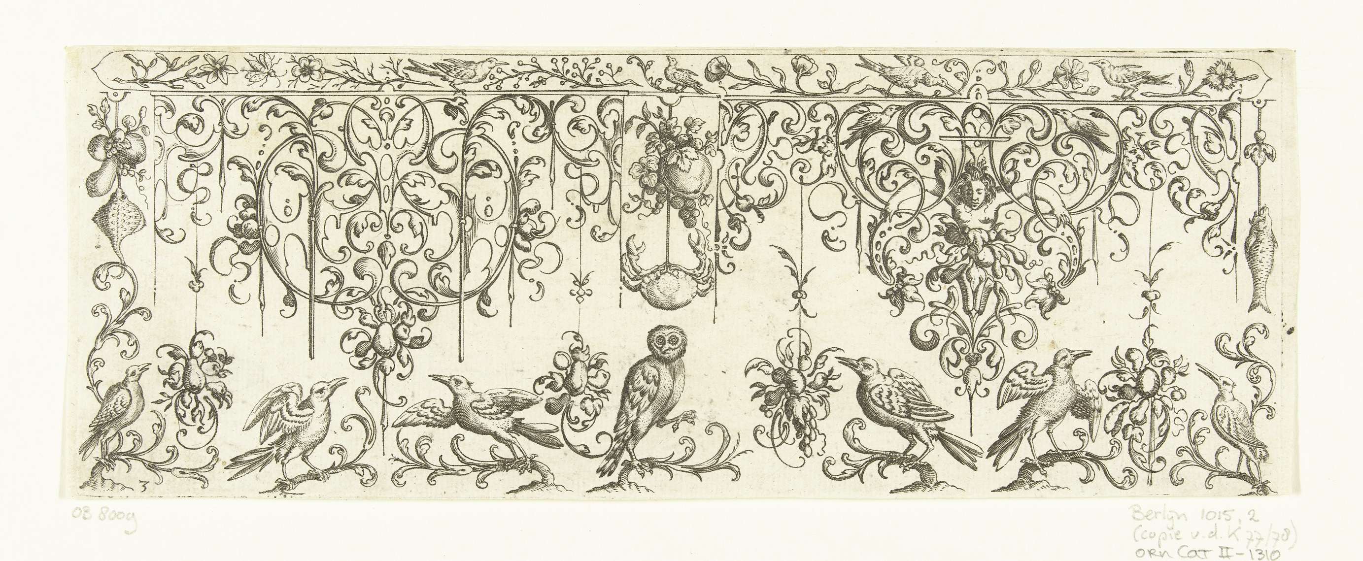 Tegenzijdige kopie naar prenten (blad 6 en 7) uit de serie Somige Eenvoldige Vruchten en Spitsen. Midden onder zit een uil, daarboven hangt een krab. Uit serie bladen waarop telkens twee motieven naast elkaar te zien zijn, aangevuld met vogels, insecten, bloempotten en soms een ornamentele rand met ranken en dieren.