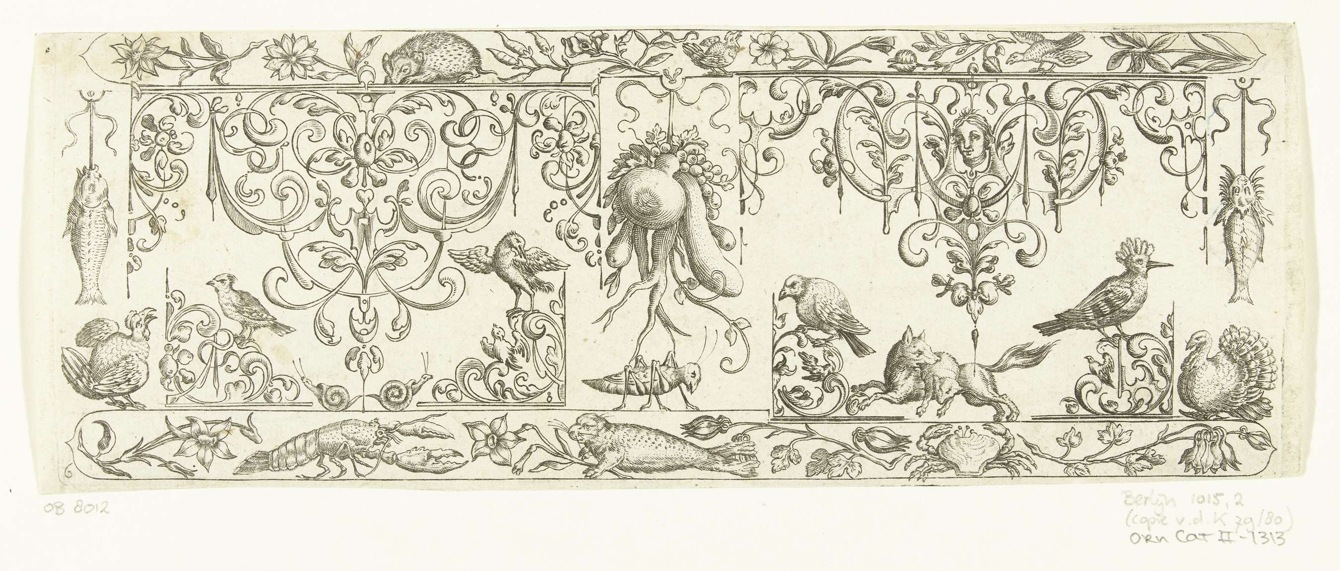 Tegenzijdige kopie naar prenten (blad 8 en 9) uit de serie Somige Eenvoldige Vruchten en Spitsen. Uit serie bladen waarop telkens twee motieven naast elkaar te zien zijn, aangevuld met vogels, insecten, bloempotten en soms een ornamentele rand met ranken en dieren.