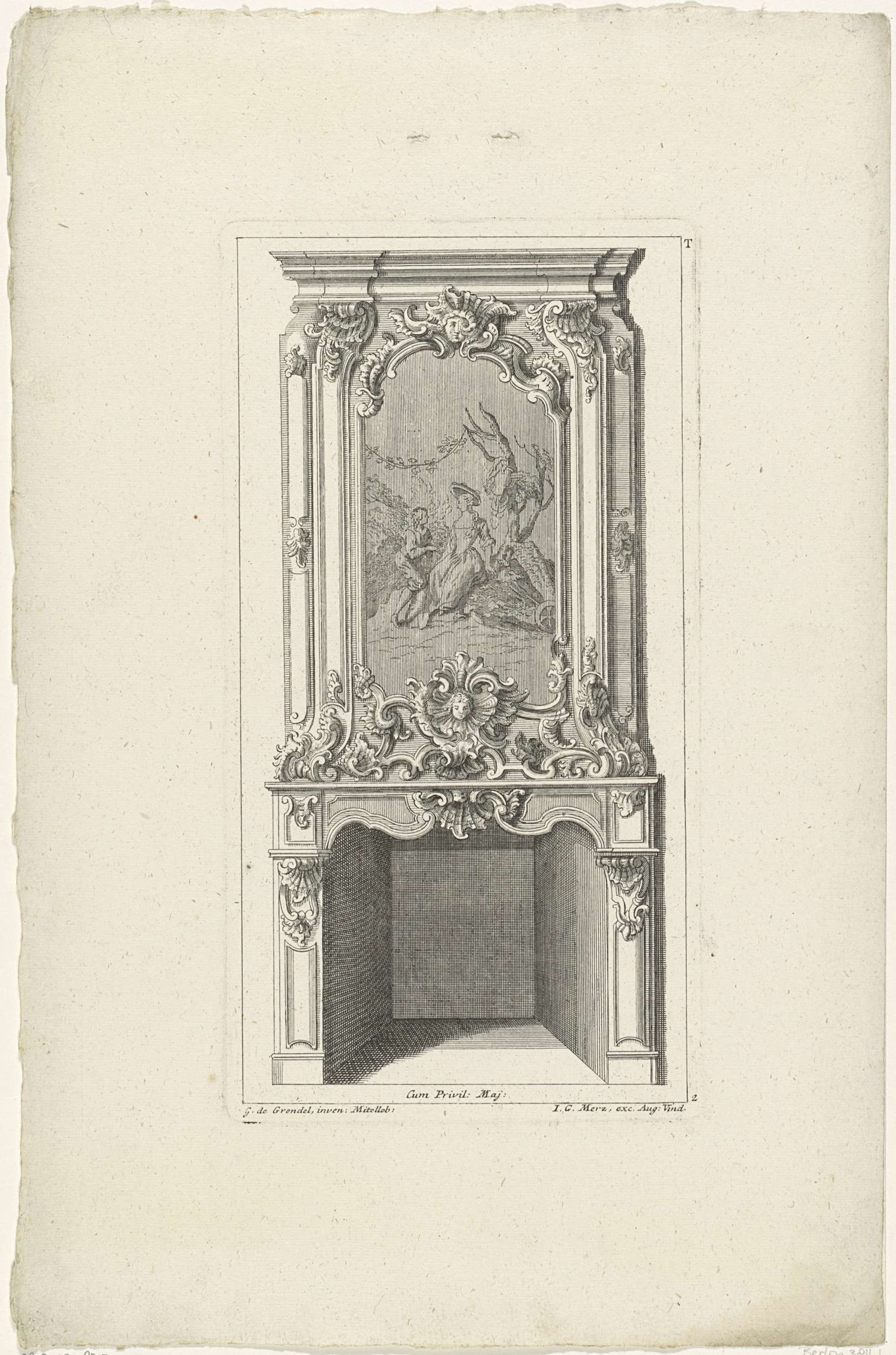 Ontwerp voor een schoorsteen met een pastorale voorstelling van een jongeman bij een jonge vrouw met hoed. De schoorsteenmantel is versierd met rocaille-, schelpornamenten en maskers.