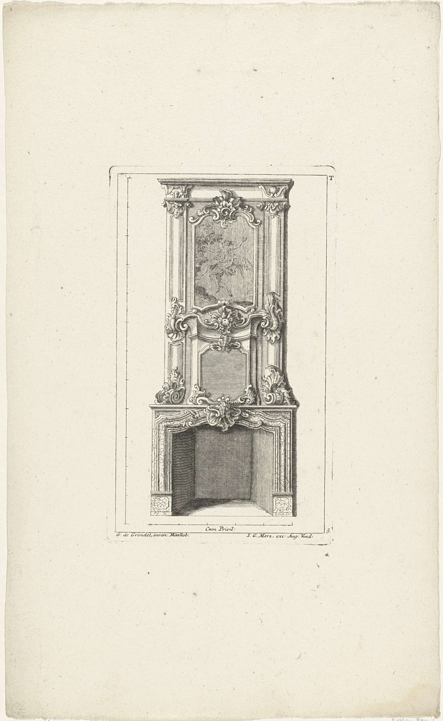 Ontwerp voor een schoorsteen met een voorstelling van Boreas die Oreithyia ontvoert. De schoorsteenmantel is versierd met rocailleornamenten, voluten en vruchten.