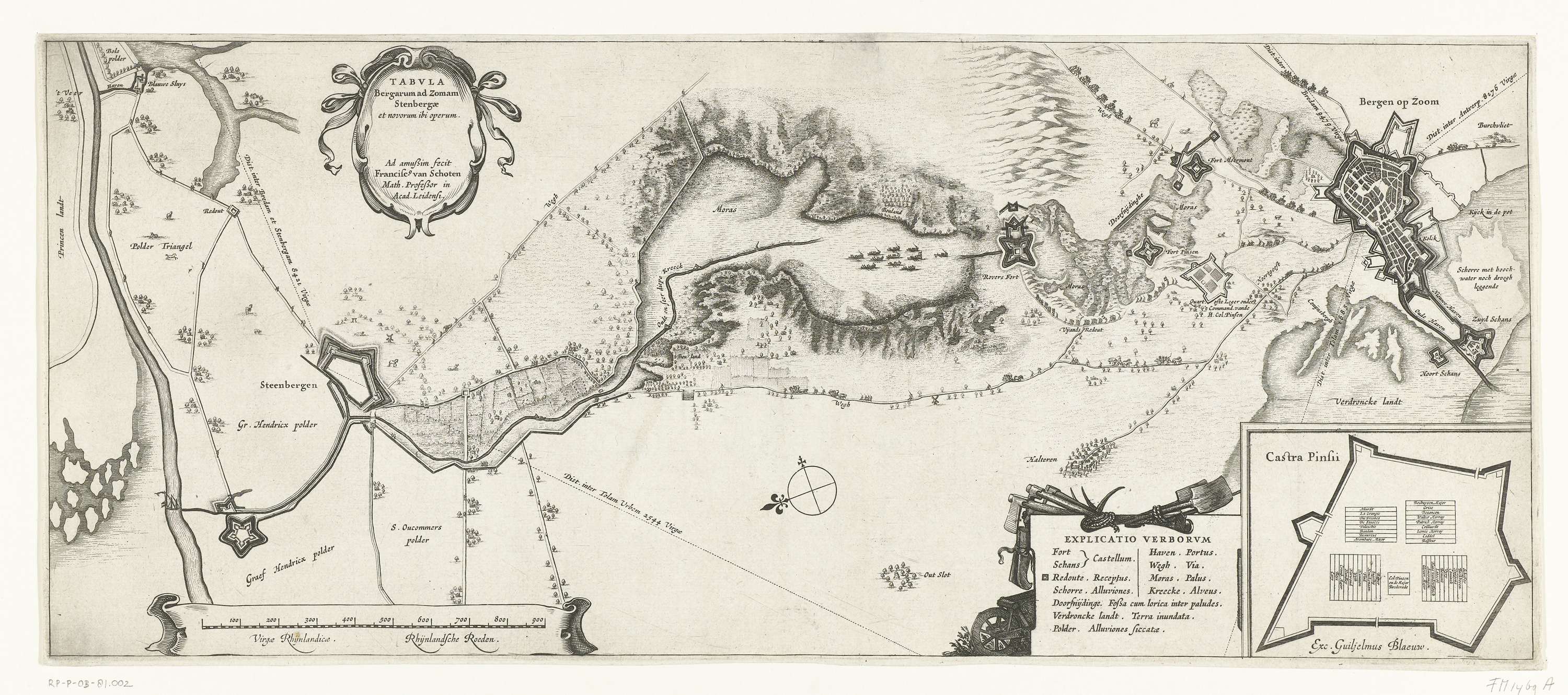 Kaart van het mislukte beleg van Bergen op Zoom door het Spaanse leger onder Spinola en Velasco, 18 juli - 3 oktober 1622. Kaart van Bergen op Zoom met het gebied tot Steenbergen. Met drie cartouches met de Latijnse titel, een woordenverklaring Nederlands-Latijn en de plattegrond van het Fort Pinsen (Castra Pinsii).