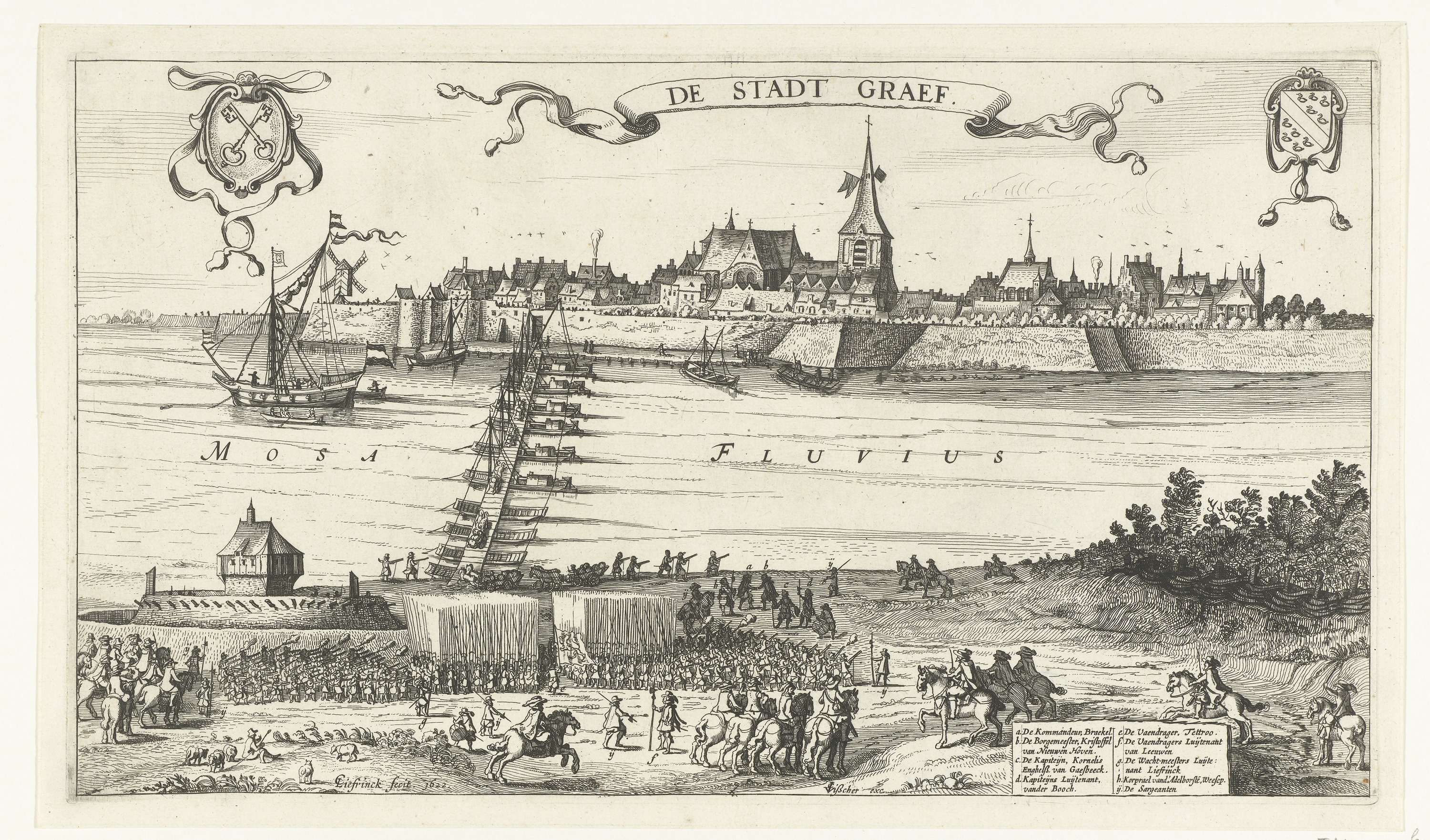 De aankomst van de Leidse schutterij bij Grave, 26 september 1622. De troepen verzamelen zich aan de oever van de Maas bij de schipbrug. Onderaan de legenda a-ij. Boven in de lucht de wapens van Leiden en Grave. Onderdeel van een serie van 3 prenten van de tocht van de schutterij van Leiden naar Grave ...