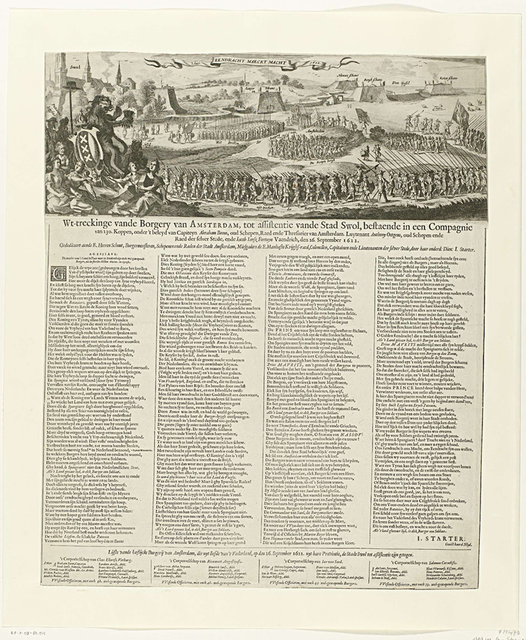 Tocht van de schutterij van Amsterdam naar Zwolle ter assistentie van de verdediging tijdens de Spaanse aanval op de stad, 26 september 1622. Links de stad, centraal de oprukkende schutters. Links de Hollandse Leeuw met het wapen van Amsterdam. Hierbij ook de allegorische figuren van Twist, Nijd, Scheuring in de Staet en Tweedracht in de ...