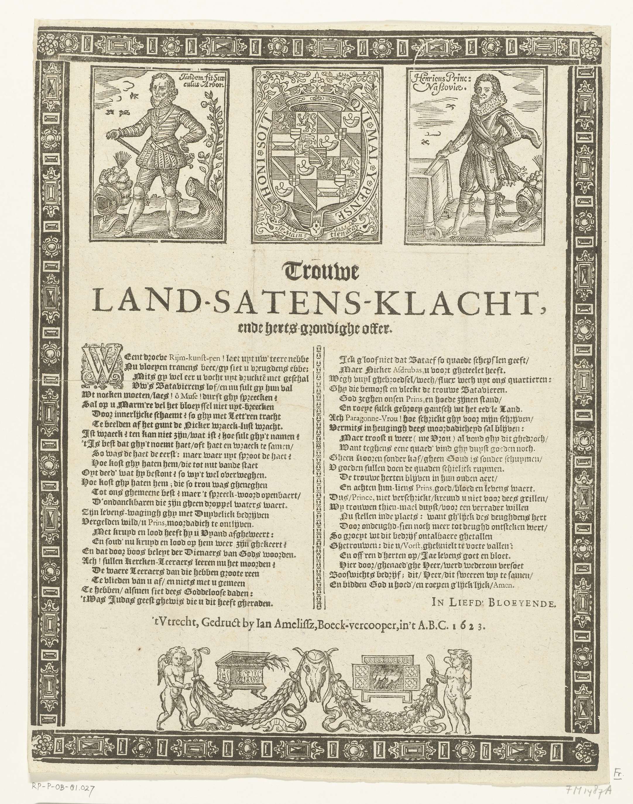 Gedicht door trouwe landzaten ter ere van prins Maurits na de ontdekking van de samenzwering tegen de prins, 1623. Bovenaan portretten van Maurits en Frederik Hendrik aan weerszijden van het wapen van Maurits. Vers in twee kolommen in ornamentele rand. Onderaan een ornament met putti met guirlande en festoen.