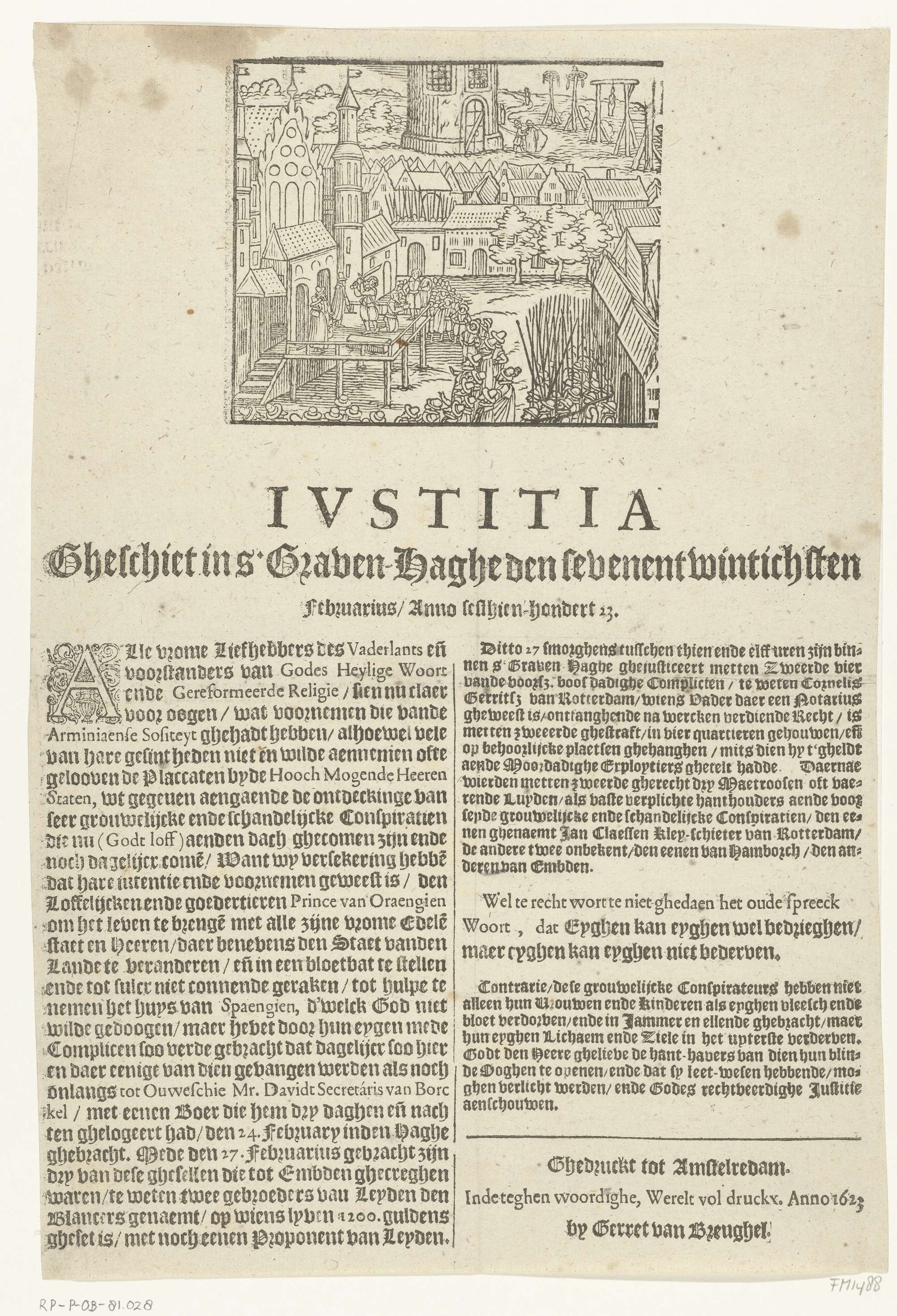 Terechtstelling van de Cornelis Gerrits en drie zeelieden, samenzweerders tegen prins Maurits, 27 februari 1623. De voorstelling toont een openbare terechtstelling op een schavot op het Binnenhof voor de Ridderzaal in Den Haag, in werkelijkheid werd deze terechtstelling voltrokken op het Groene Zoodje. Onder de voorstelling in 2 kolommen een beschrijving van de gebeurtenissen.