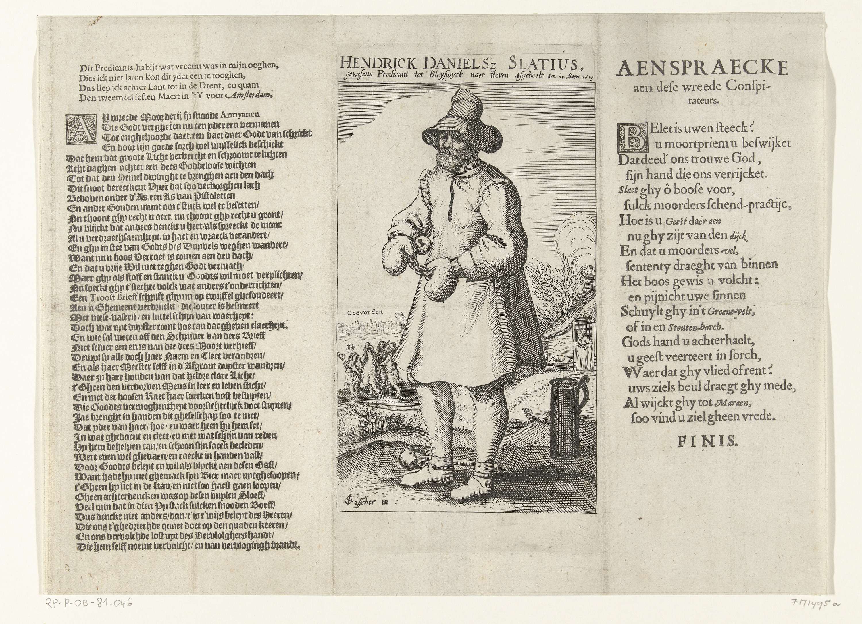 Portret van Henricus Slatius, één van de samenzweerders tegen Maurits, met hand- en voetboeien, in de kleding waarin hij werd gevangengenomen, 1623. Rechts op de grond de bierkan, op de achtergrond Coevorden. Links van de plaat een vers, rechts de 'Aenspraecke aen dese wreede Conspirateurs', in het Nederlands.