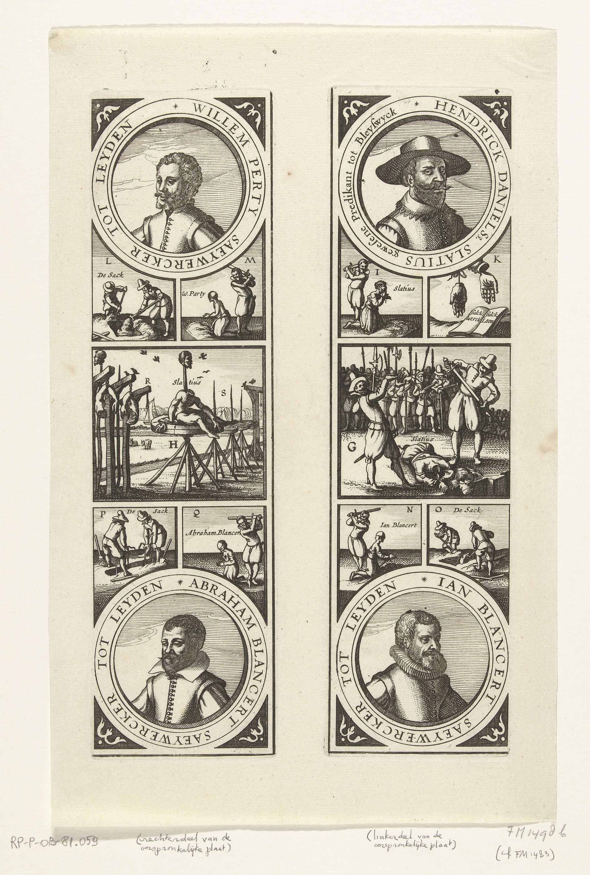 De terechtstelling van Henricus Slatius, Willem Perty en Jan en Abraham Blansaert, veroordeelde samenzweerders tegen Maurits, 5 mei 1623 te Den Haag. Ronde portretten van de veroordeelden met scènes van de executies en het tentoonstellen of begraven van de lichamen. Het lichaam van Slatius op het rad bij Rijswijk. De oorspronkelijke plaat in tweeën gedeeld ...