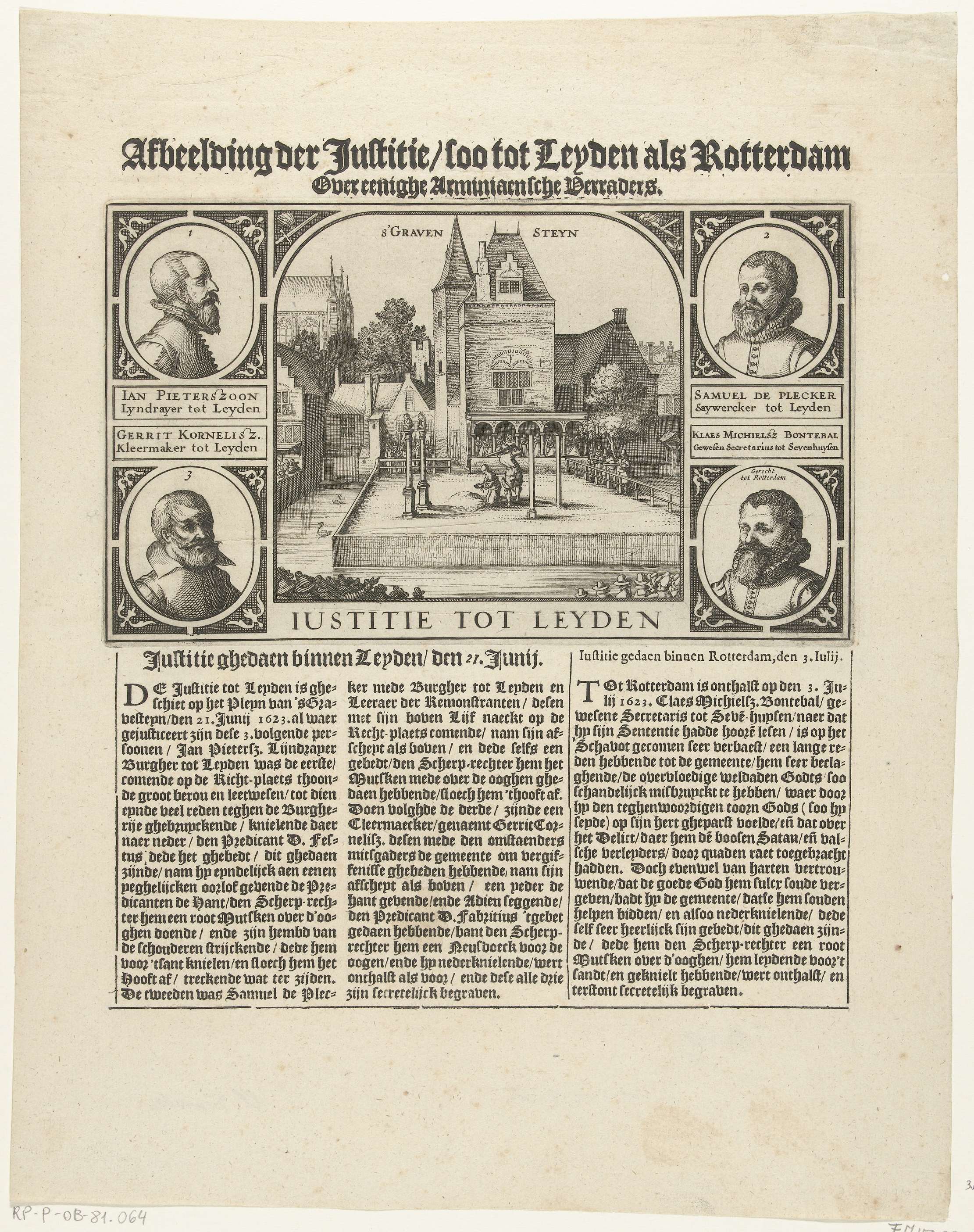 De onthoofding van vier arminianen Jan Pieterszoon, Gerrit Kornelisz. en Samuel de Plecker bij het Gravensteen te Leiden op 21 juni 1623 en Klaas Michielsz. Bontebal onthoofd op 3 juli 1623 te Rotterdam, allen veroordeeld als medeplichtigen aan de samenzwering tegen Maurits. Een onthoofding op het terrein bij het Gravensteen te Leiden, hieromheen portretten van ...