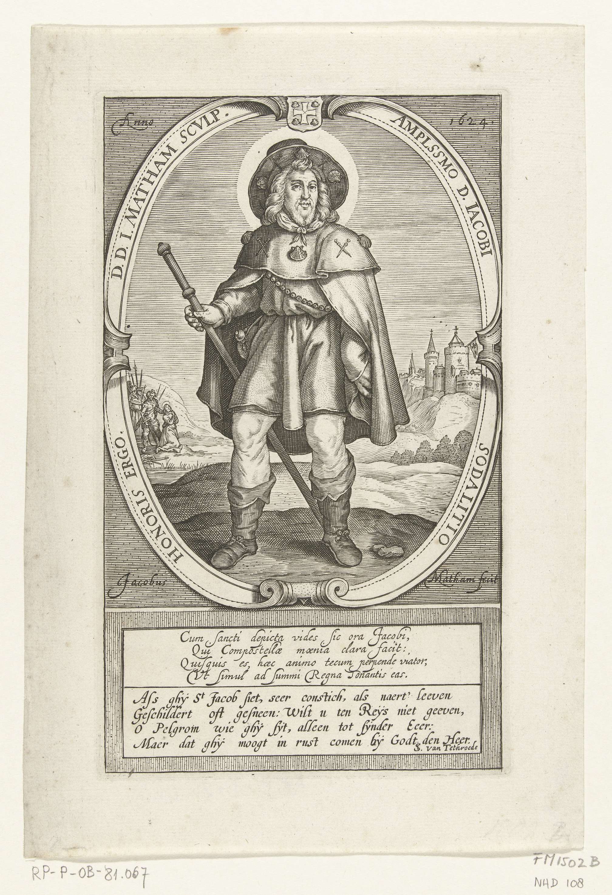 Het blazoen van het Sint Jacobsgilde te Haarlem, 1624. Cartouche met de heilige Jacobus als pelgrim. Met onderschrift van 4 regels in het Latijn en 4 regels in het Nederlands.