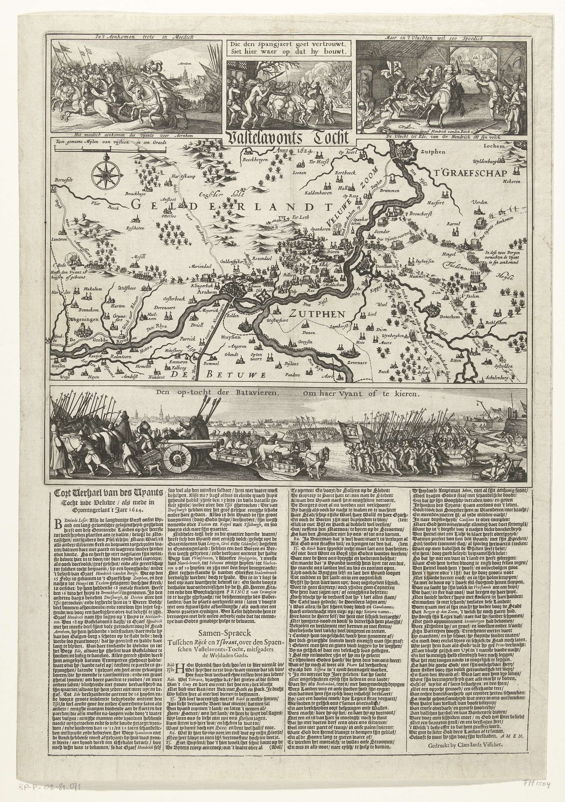 Inval door graaf Hendrik van den Bergh in de Veluwe in een deel van Gelderland en graafschap Zutphen en de daaropvolgende vlucht, 15-23 februari 1624. Centraal een kaart van het gebied rond Arnhem en Zutphen, boven voorstellingen van de inval en aftocht van het Spaanse leger, in het midden moord en brand aangericht door de ...