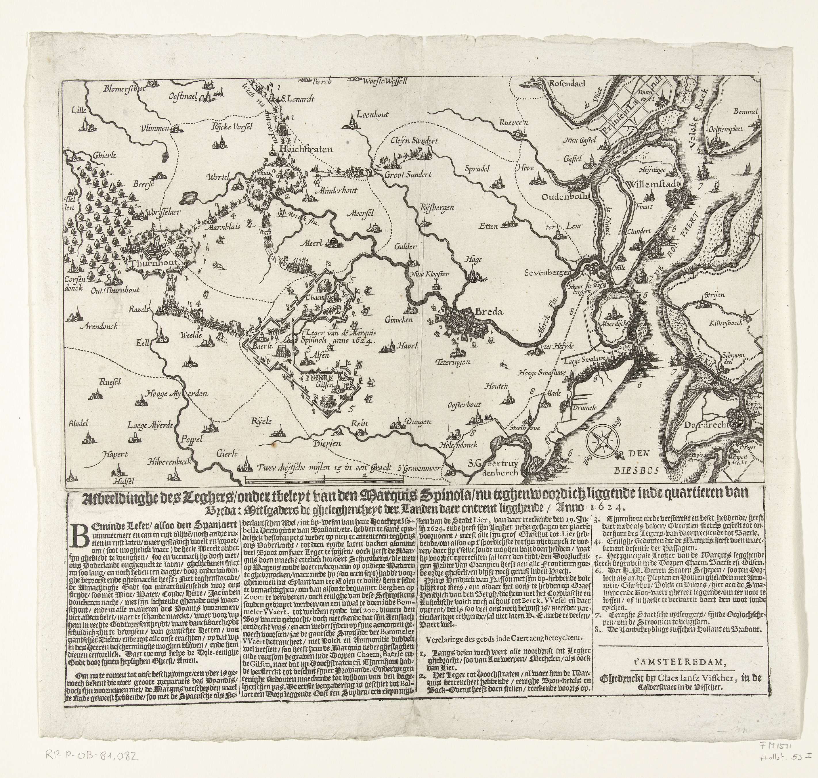 Begin van het beleg van Breda door het Spaanse leger onder Spinola, 19 juli 1624. Kaart van Breda en het omringende land van Dordrecht tot Turnhout. Op het blad onder de plaat 4 kolommen tekst met de legenda 1-8 in het Nederlands.