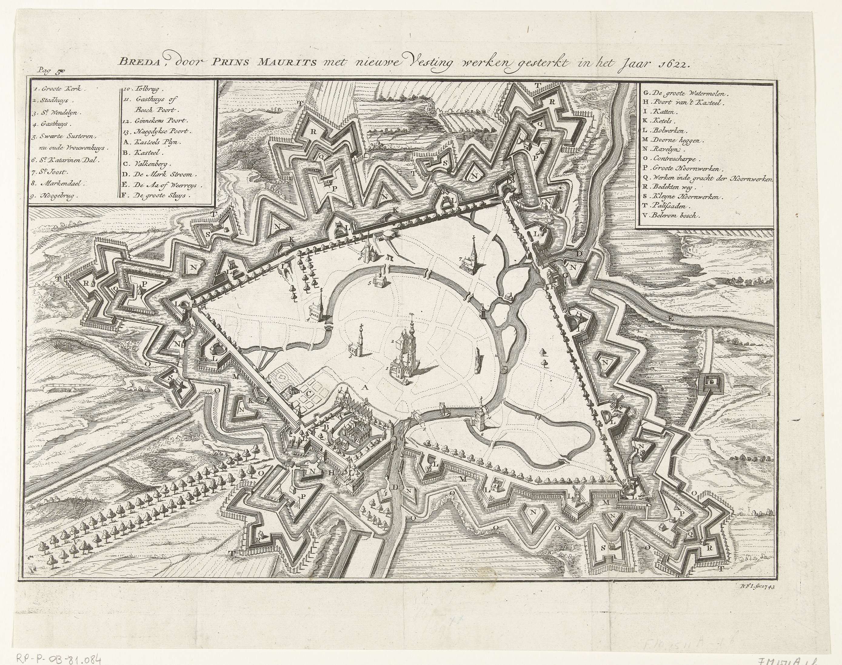 Plattegrond van de stad Breda waarop aan gegeven de versterkingen die in 1622 op bevel van Maurits zijn aangelegd. Links- en rechtsboven twee cartouches met de legenda's 1-13 en A-F en G-V.